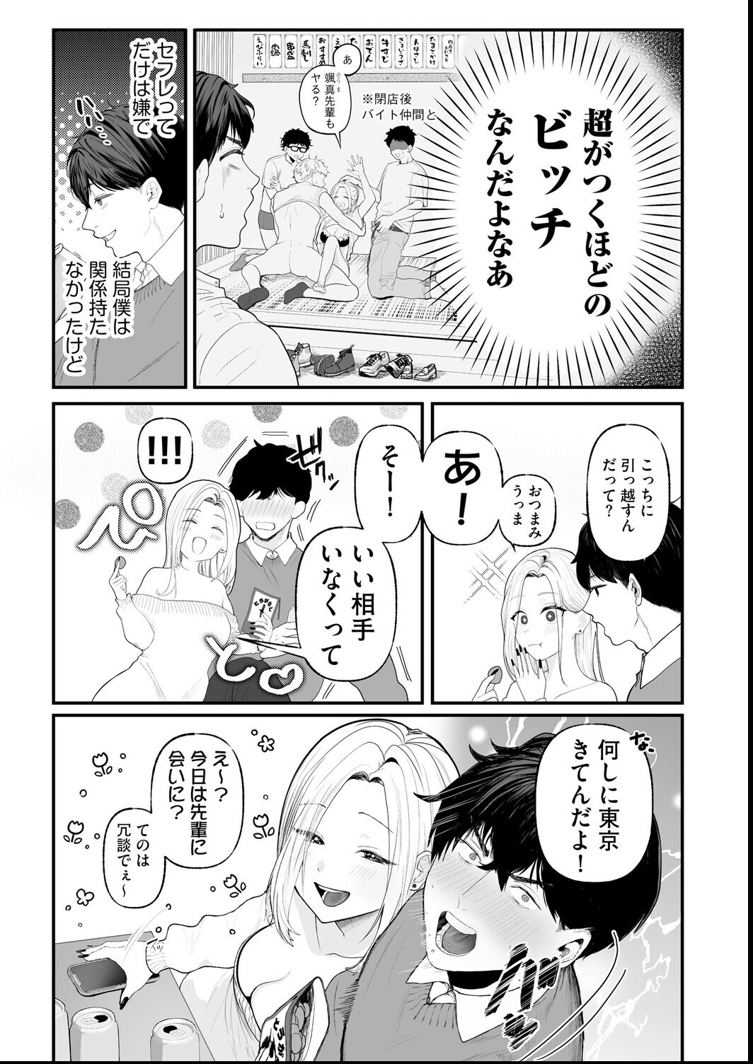 カタブツと称される主人公の貞操観念が、奔放なビッチ後輩によって上書きされていく過程を丁寧に描いている。とうの氏のギャルキャラは表情が豊かで、タイトルに散りばめられた口語的表現がキャラクターの個性を端的に示す工夫として機能している。