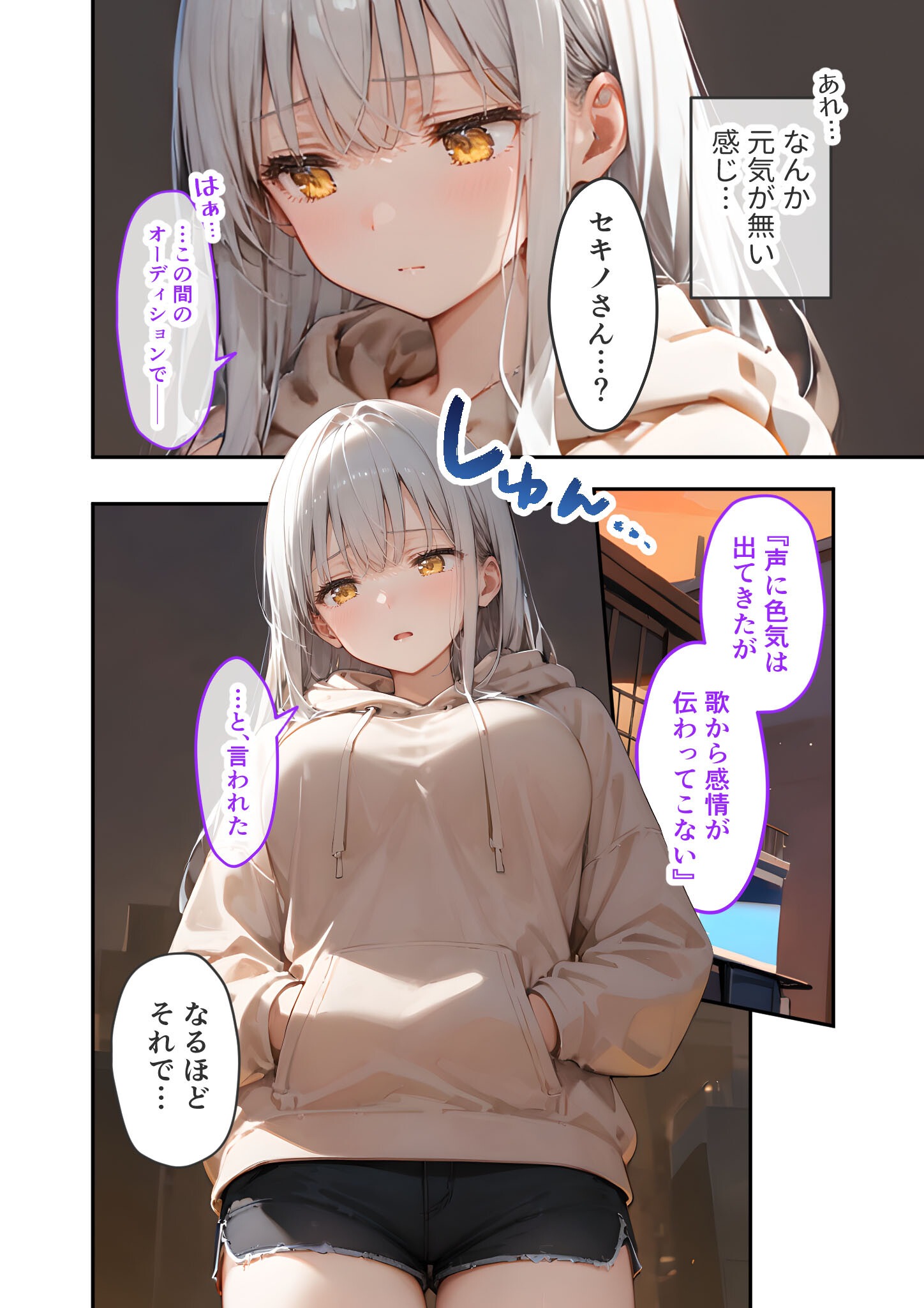 「『声に色気は出てきたが、歌から感情が伝わってこない』…と、言われた」 「また、特訓に付き合ってほしい」 前にもセキノさんから言われたぞこんなこと…! 「…ねえ、瑞樹 感情って、どうやったらうまく出せる?」 「やっぱ、演技するとかじゃない?」 「前にコスイベでサキュバスの恰好だったじゃない、あんな感じで、何かの役になりきってみれば?」 さすが瑞樹、パーフェクトアイデア! 「…分かった。じゃあ、恋人っぽくセックスするから教えて」 「ちょっ!?」 「…今日はこんなのもある」 瑞樹の使用済み手袋っ…!? 「…これを、ローションでぬとぬとにする」 コミック47P+おまけイラストページ3P収録! 【注意事項】 ※本作品のシチュエーションは全てフィクションです。登場する人物や設定等は、すべて架空のものとなります。 ※この作品内に登場するキャラクターは全員20歳以上です。 ※本作品はAIによる生成画像を使用して制作しております。 ※犯罪、その他違法行為を美化または助長する意図はございません