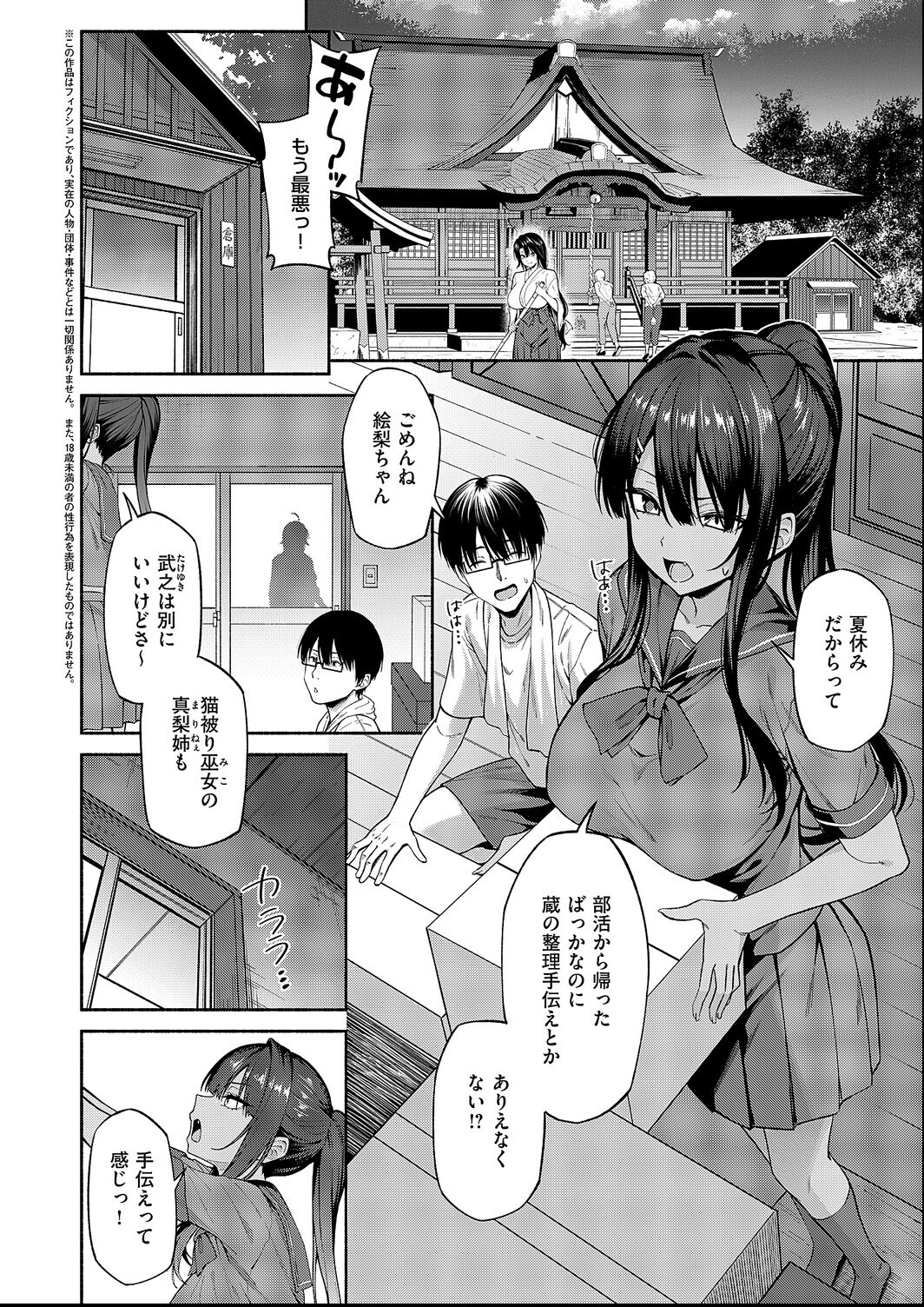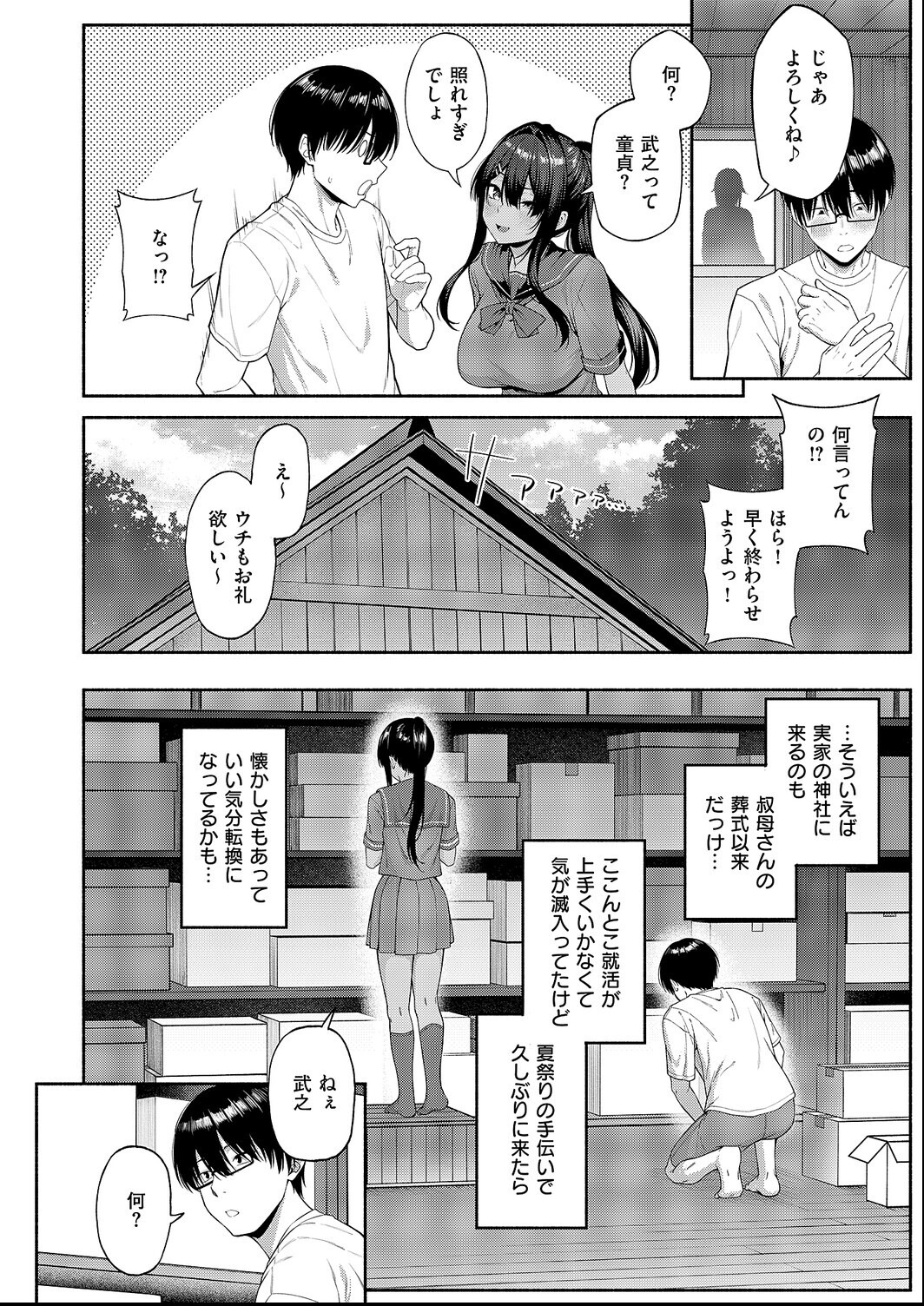夏祭りの準備でギックリ腰になった神主の祖父の代わりに手伝いをするため、 田舎に帰省することになった武之。 すると、従姉妹のJK・絵梨と一緒に倉庫を片付けることに。 しかし、整理中に張り型を壊したことがきっかけで武之はオスの欲望を抑えられなくなり…!? えち度&可愛さマン点★有馬紘一先生が描く、片田舎ハードH物語開幕♪