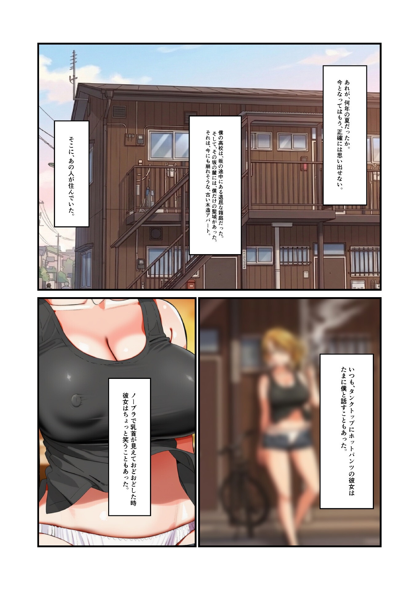 忘れられない夏がある。俺を’オトコ’にしてくれた、あの人の肌の熱が――。 ●校時代の夏。彼女もいない、ただの童貞だった僕。 通学路の木造アパートで見かける金髪でヤンキーな彼女は、手の届かない憧れの人だった。 だが、周りの友達が童貞を喪失しているなか、焦りと劣等感で爆発寸前だった僕は、気づけば彼女の部屋のドアを叩き、土下座していた。 「俺を、男にしてください!」 彼女が呆れ顔で始まった「授業」。 濃厚なキス、汗ばむ肌、そして僕の上で乱れる彼女の姿…。 「…久しぶりかも、こんなの…」 教えるはずだった彼女が、久々のセックスにハマっていく。 そして、俺の熱をその奥深くに求め、迎えた絶頂――。 これはただの思い出話じゃない。 一人の少年が、ある女性の優しさによって大人になる、切なくも淫らな青春の記録。