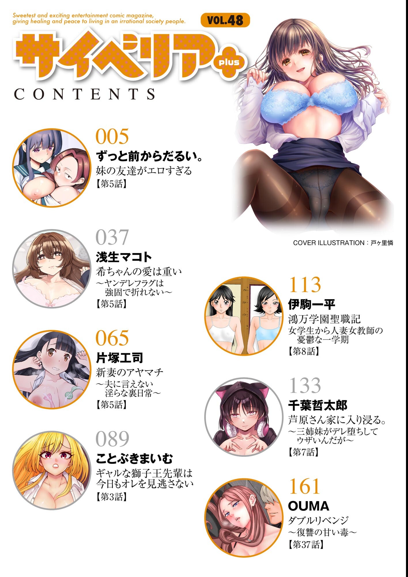 出会いの季節は過ぎて、出会ったあの子とひと足進む大型連休! 据え膳食わぬは男の恥ぞ! 気持ちも体も踏み込んで本格的な『お付き合い』を始めよう!! 妹とその友達、二人の心と体に踏み込んだ兄貴の選択は…!? ずっと前からだるい。の『妹の友達がエロすぎる』!! ついにひざを突き合わせての…あれ? ラブラブカップル(?)といえば浅生マコトの『希ちゃんの愛は重い 〜ヤンデレフラグは強固で折れない〜』! 愛しの優くんをおもちゃにされた希ちゃんの怒りの矛先は…!? そしてエロ三姉妹に振り回される千葉哲太郎の『芦原さん家に入り浸る。 〜三姉妹がデレ堕ちしてウザいんだが〜』。…ほう、お外でシチュエーションプレイですか、たいしたものですね。 ほかにもまだまだたくさん要チェックな魅力的な作品が目白押し!! 【掲載作品】 妹の友達がエロすぎる【第5話】/ずっと前からだるい。 希ちゃんの愛は重い 〜ヤンデレフラグは強固で折れない〜 【第5話】/浅生マコト 新妻のアヤマチ 〜夫に言えない淫らな裏日常〜【第5話】/片塚工司 ギャルな獅子王先輩は今日もオレを見逃さない【第3話】/ことぶきまいむ 鴻万学園聖職記 女学生から人妻女教師の憂鬱な一学期【第8話】/伊駒一平 芦原さん家に入り浸る。 〜三姉妹がデレ堕ちしてウザいんだが〜【第7話】/千葉哲太郎 ダブルリベンジ 〜復讐の甘い毒〜【第37話】/OUMA 表紙イラスト/戸ヶ里憐 (敬称略)