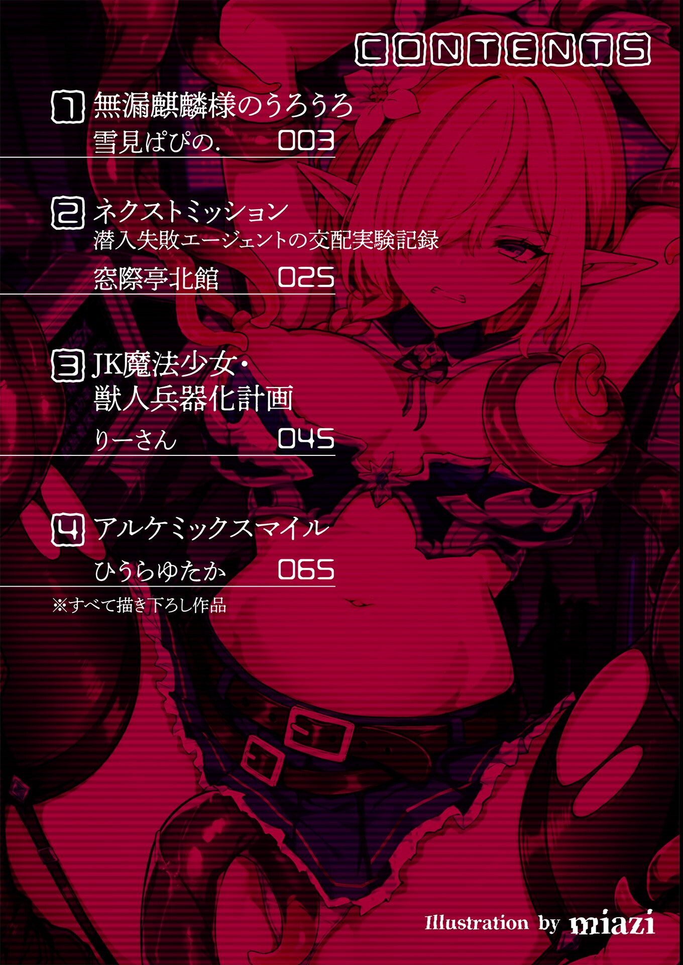 禁断の交配実験アンソロジー第二弾!望んだ結果が出てもなお、交配実験は終わらない……! 【収録作品】 『無漏麒麟様のうろうろ』 漫画:雪見ぱぴの. 各地を旅する竜人の少女、ウカ。 しかしある日、とある宗教と出会ったことで彼女の境遇は一変する。 神の使いとして崇められ、信者たちに囲まれる日々を送ることに――。 だがある日、信者の一人によって、 「神の子」を造るための実験の母体にされてしまい……!? 触手に責め立てられ、度重なる快楽により思うように力が入らないウカ。 何度も強●絶頂を迎えさせられ、その身も心も堕とされていく……。 そしてついに、彼女の胎には子が宿ってしまい――。 『ネクストミッション 潜入失敗エージェントの交配実験記録』 漫画:窓際亭北館 政府お抱えの美人エージェント、アレッサは怪しい実験を行う研究施設へ潜入。 しかし動きを察知され、施設の一室に閉じ込められてしまう! そして、研究員は彼女を「交配実験の母体」にすると告げ……。 現れたバケモノに捕まった彼女は、 媚薬で敏感になった身体は触れられるだけで快楽に震え、 現れた怪物に囚われて弄ばれていく……。 果たしてアレッサはこの絶望的な状況から脱出できるのか!? 『JK魔法少女・獣人兵器化計画』 漫画:りーさん 人に害を為す魔獣を倒す正義の味方、魔法少女。 刃宮寺澪は‘最強’と名高い少女だった。 今日も現れた敵を華麗に倒す――はずだったが、それは罠だった! 囚われた澪は拘束され、身体を改造する実験の被験体にされてしまう。 魔獣や戦闘員たちに瑞々しい身体を弄ばれ、胸を責められ、 ペニスを咥えさせられ、ついには挿入まで……。 身体を穢されるたび、 澪の肉体は徐々にケモノへと近づいていき――!? 『アルケミックスマイル』 漫画:ひうらゆたか 凄腕錬金術師の師匠に、日々エロい実験をさせられているお弟子ちゃん。 今日こそ拒否!……のはずが、褒め言葉に乗せられて結局参加することに。 今回のテーマは「新種触手の繁殖方法」!? 母体役にされたお弟子ちゃんは、おっぱいを吸われ、下を弄られ大絶頂! しかも触手は次第に暴走を始めてしまい……? 果たして実験の結末はどうなってしまうのか――! 表紙:miazi