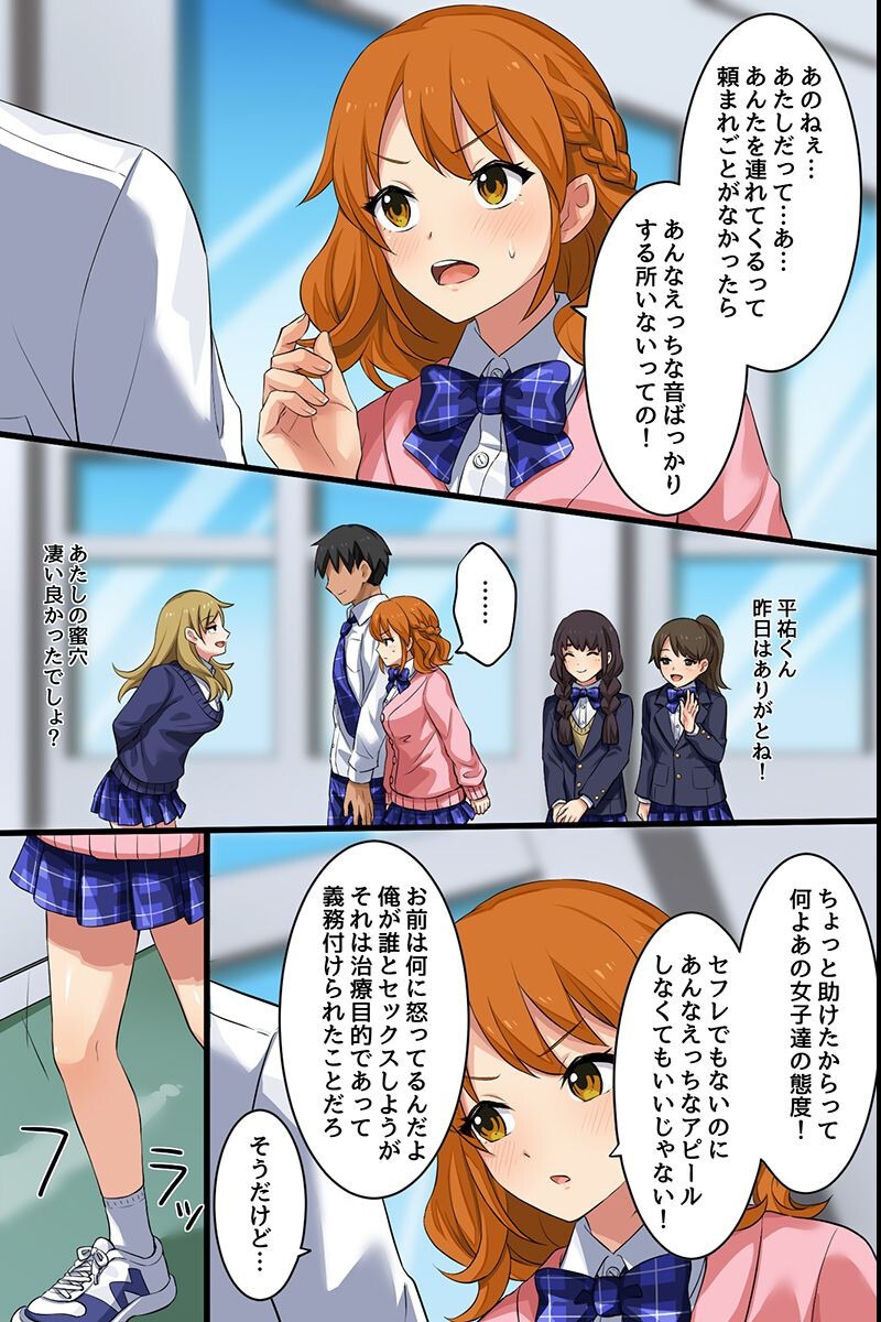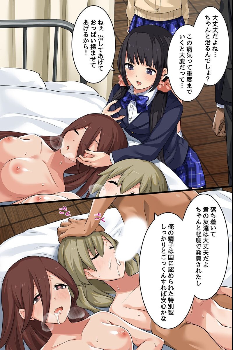 女性のみに発症する「突発性発情症」が蔓延した世界。病の回復を促す精液を持った主人公、平祐のもとへは毎日のように女子たちから声が掛かる。普通に学園生活を送りながら、女子が発症すれば自身の精液を提供する。いつものように治療を終えて教室を出るとクラス女子の楓花が待ち構えていた。何気ない会話を交わしながら廊下を歩いていると、楓花が発情症の初期段階にあると気づく。楓花を空き教室に連れて行き、目の前にち○ぽを突き出す。遠慮する楓花を無視して口に挿入し何とか精液を飲ませる。ほっとしたのも束の間。別の女子、葵衣が慌てて主人公を呼びに来て―。貴重な精液を持つ主人公のち○ぽは今日も大忙し!あっちでこっちで精液を求められてどぷどぷ出しまくる!!・主人公の精液は激レアで女性のみに発症する「突発性発情症」を治療できる・保健室で初期症状で倒れた女子にフ○ラで精液提供・クラス女子、楓花と雑談中に突然発症!すぐに空き教室に入ると触っただけで即絶頂・治療のためにフ○ラをさせて口内へ精液を注ぐ・友達の優香利を救って欲しいと葵衣に頼まれる・中度症状の優香利はトロ顔で発情しきっている・さっき射精したばかりの自身を興奮させるために葵衣も全裸にさせる・貝合わせおま○こに生挿入して膣内に大量射精・優香利を救ってくれたお礼と言いながらま○こを差し出す葵衣に生ハメ・発情顔でオ○二ーが止まらない楓花を発見・何度イッても発情が収まらないと涙目の楓花は重度症状・優香利、葵衣に協力してもらい楓花の両手を押さえてフ○ラ精飲・重度症状になるとハードなプレイじゃないと治療不可能・フ○ラしながらおま○ことア○ルにペニパン挿入して三穴同時責め。奇病で苦しむ女子たちが特別な精液持ちの主人公にハメられ、快楽にトロけていく姿をお楽しみください。フルカラーコミック