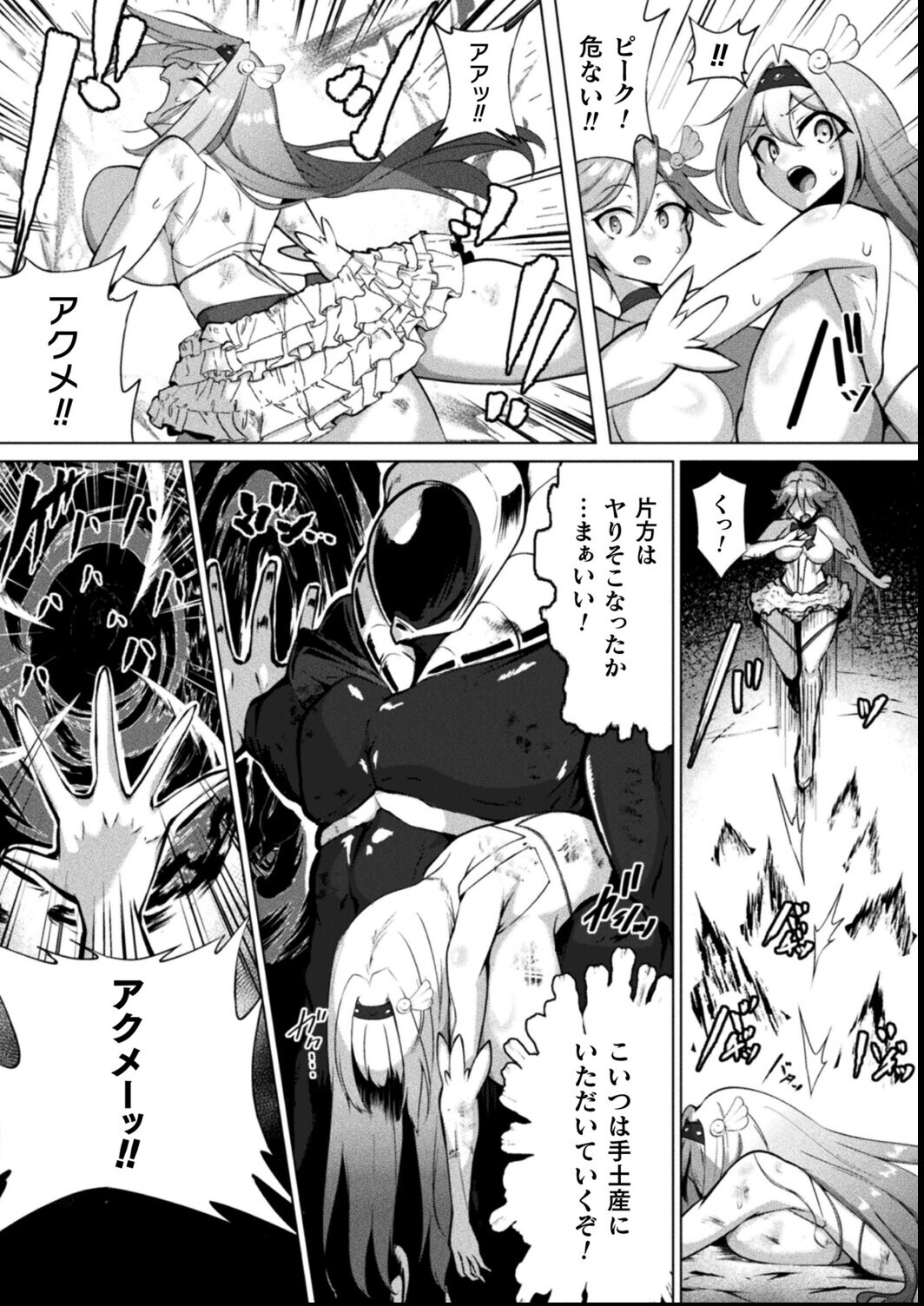 変身ヒロインの肉体美と、拘束具による幾何学的な構図の対比が見事である。アクメレーザーによる描写は単なる過激さではなく、コマ割りのリズムを巧みに利用した視覚的演出と言えよう。作者のデッサン力は確かで、エロティシズムの核心を突く表現力が光る。