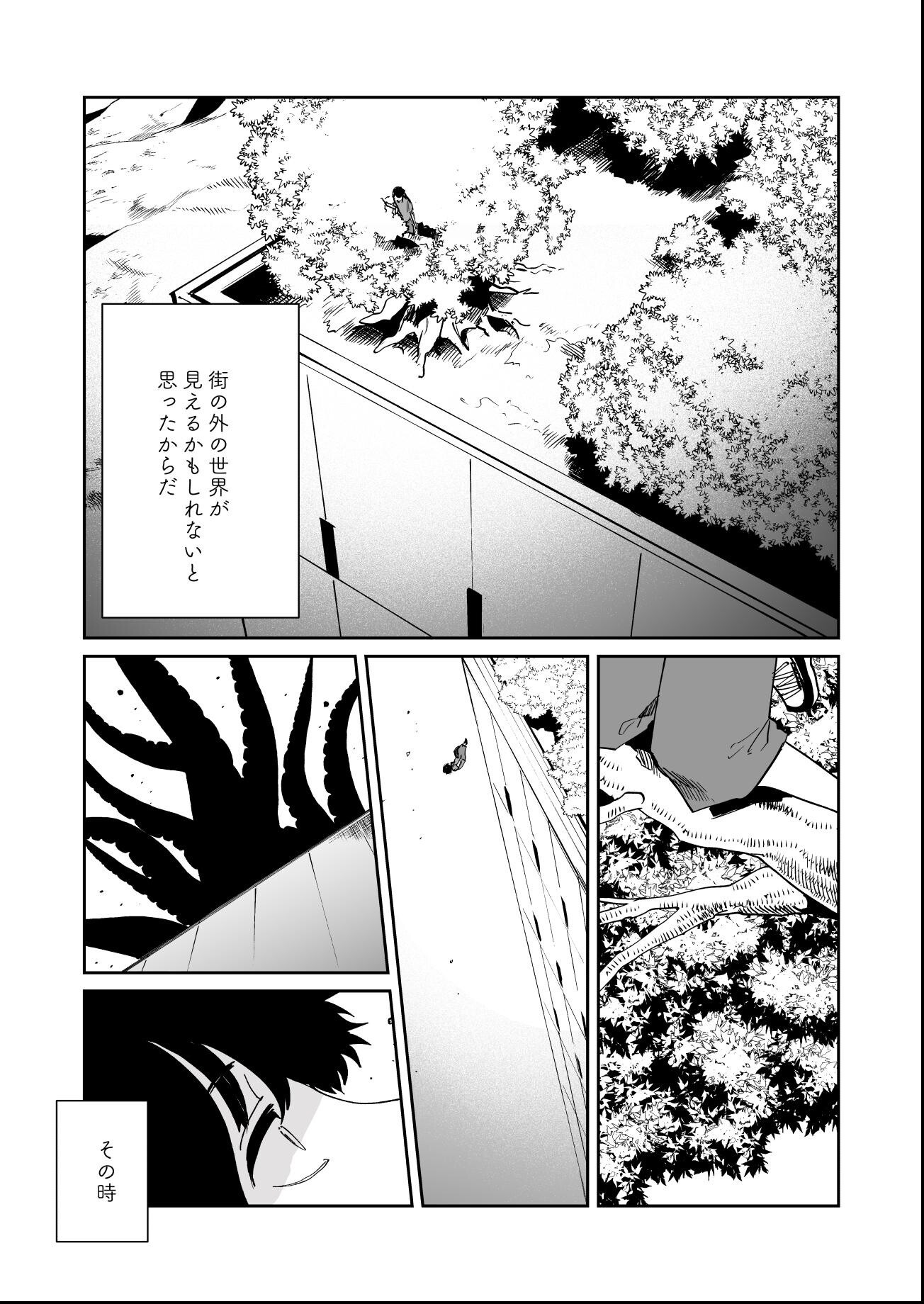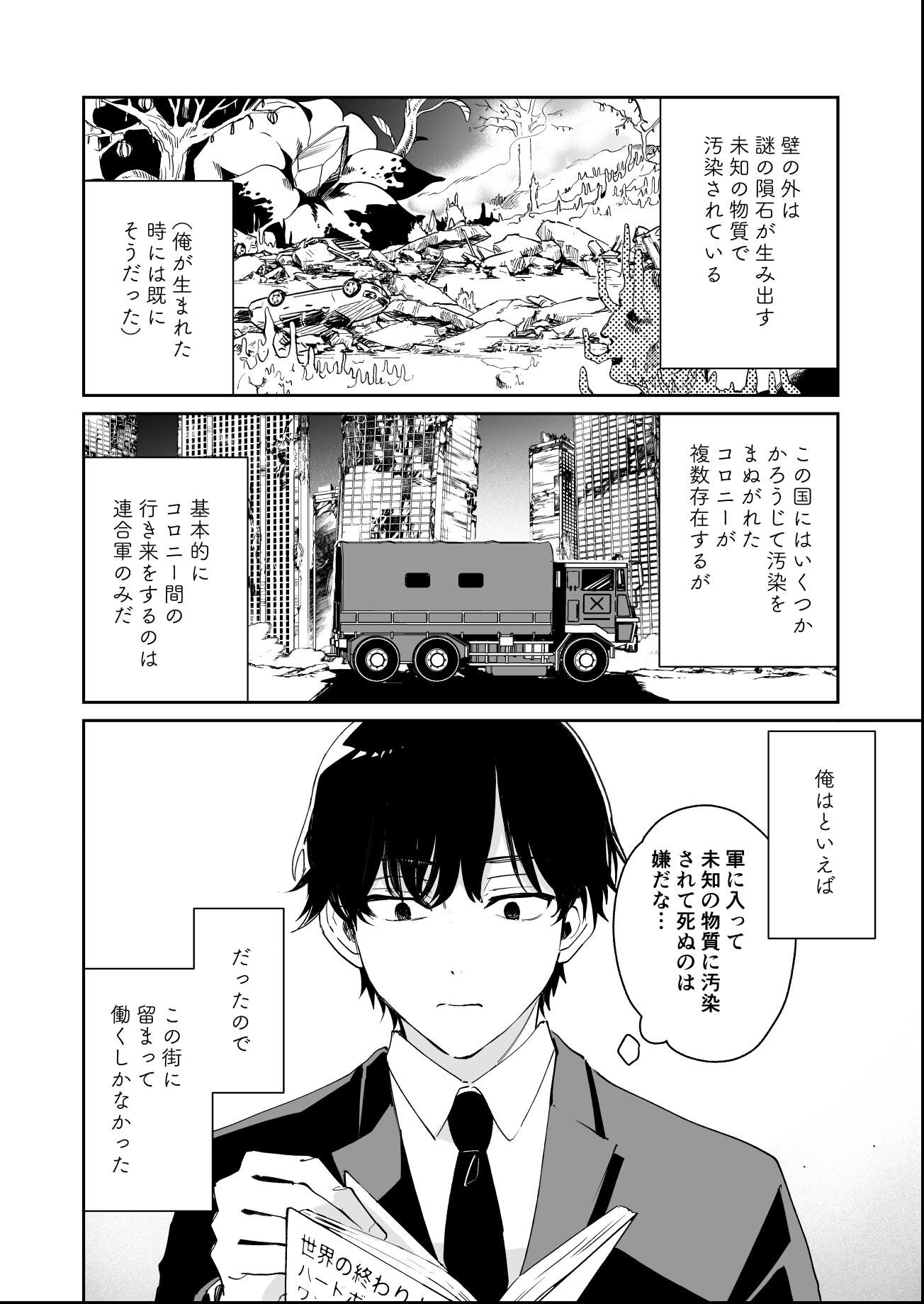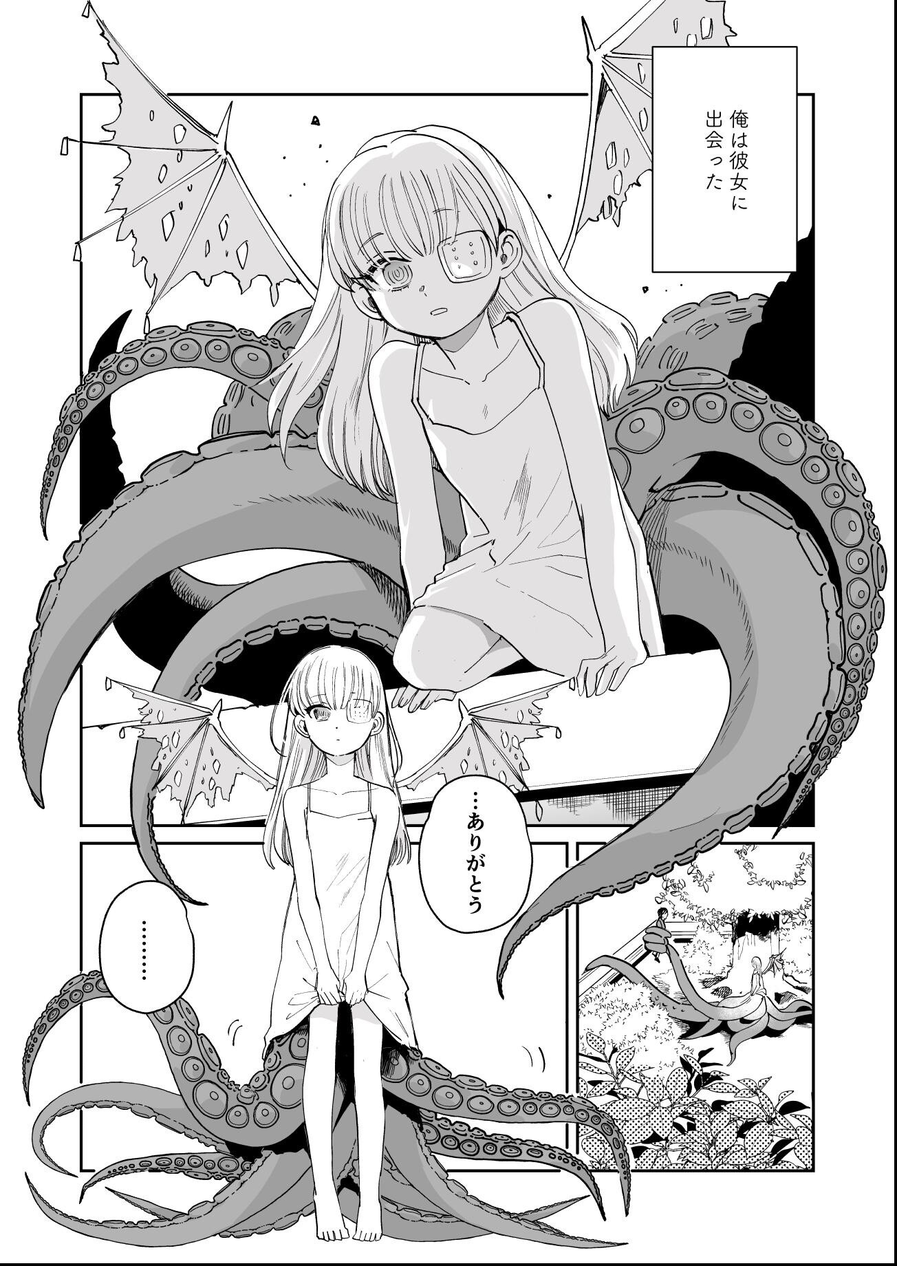 普通の男の子×人外触手宇宙人美少女のボーイミーツガール(純愛)ものです(触手は主に男の子に使われます)。00年代のセカイ系・ラノベの雰囲気を目指したSFファンタジー・ラブストーリー。上・下巻の上巻。 壁に囲まれた街、謎の隕石により汚染された外の世界、研究所、宇宙人、謎の転校生。 小さな病室で少年は少女に出会い、恋をする。