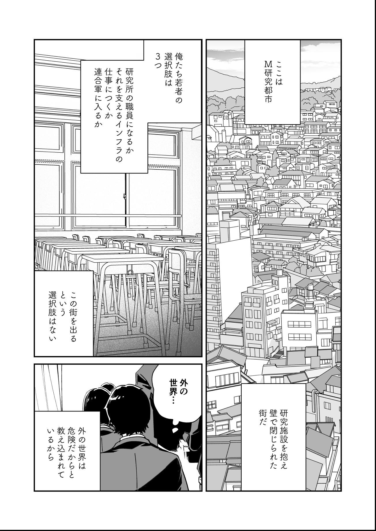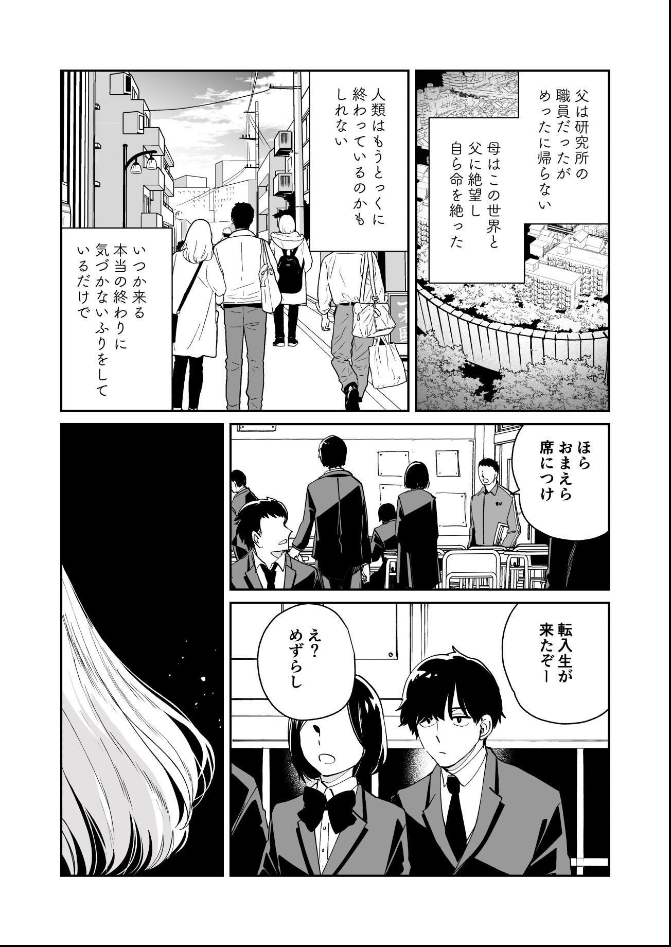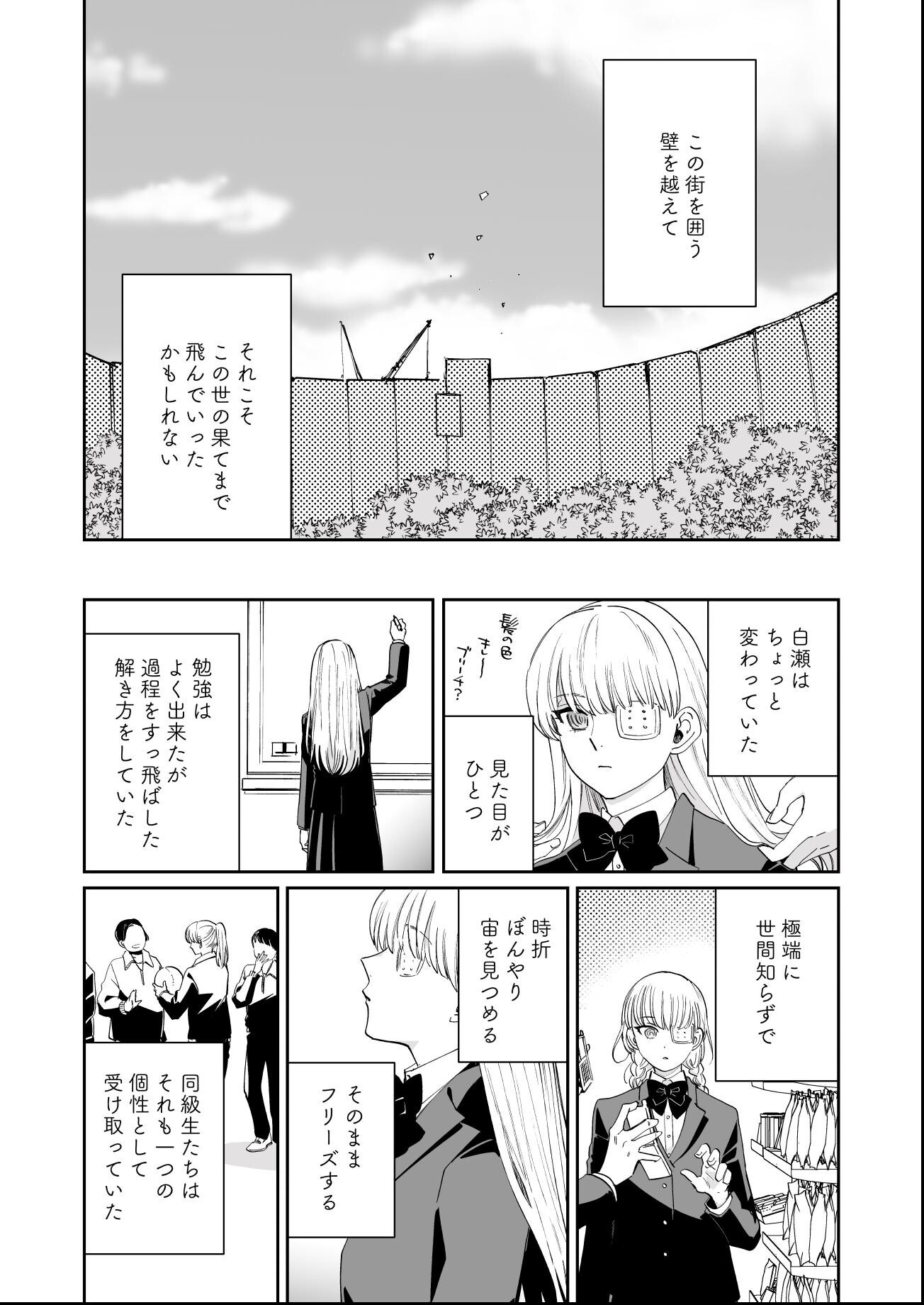 普通の男の子×人外触手宇宙人美少女のボーイミーツガール(純愛)ものです(触手は主に男の子に使われます)。00年代のセカイ系・ラノベの雰囲気を目指したSFファンタジー・ラブストーリー。上・下巻の上巻。 壁に囲まれた街、謎の隕石により汚染された外の世界、研究所、宇宙人、謎の転校生。 小さな病室で少年は少女に出会い、恋をする。