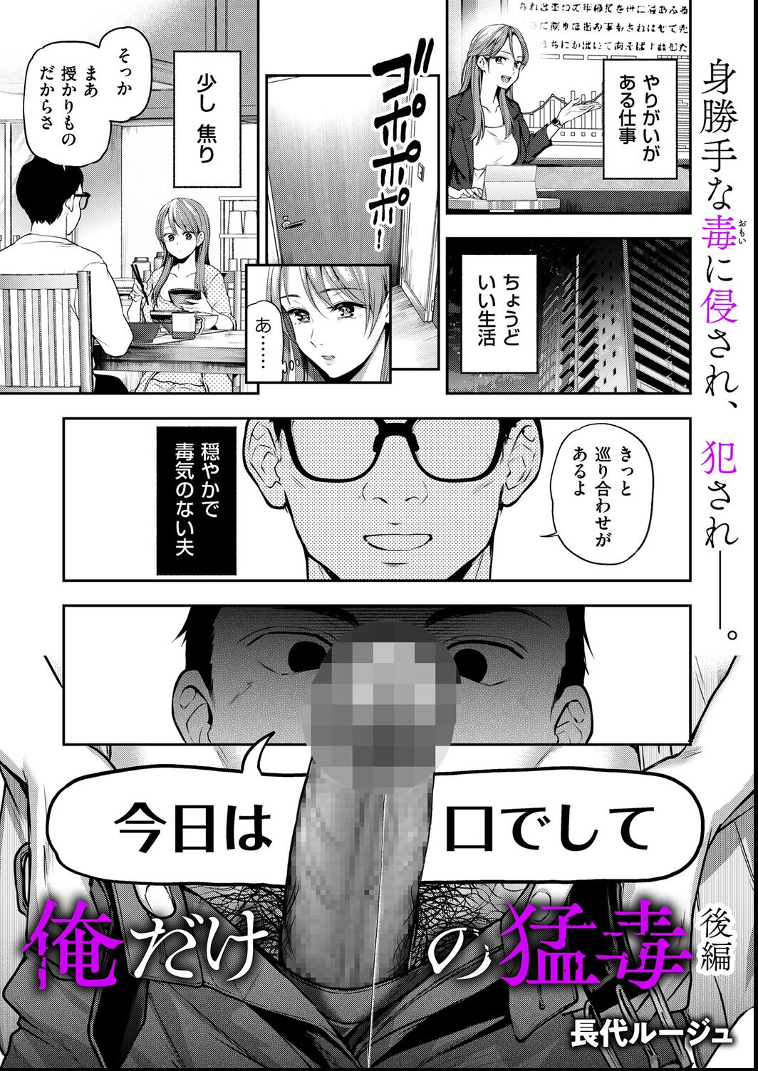 部長と仕方なくしたセックスを見られ 後輩の北原くんに脅された私は、 彼にフェラをした。それが先週のこと。 もうしない! 絶対しない! 忘れる。部長のことも、北原くんのことも……。 連休も挟んだし大丈夫。うまくやりすごそう。 でも、北原くんはそれを許さなかった。 週明け。 彼は私を応接室に連れていき、押し倒す。 だめって言ったのにキスもしてきた。 こんなこと長引かせるわけにはいかない。 早く、早く終わって……っ! しかし、そんな気持ちとは裏腹に、 北原くんの男性器に目を奪われている 自分がいることにも気付く。 おっきい……。 私でこんなに興奮してるの……? 少しずつ、私は毒に侵されていく――。