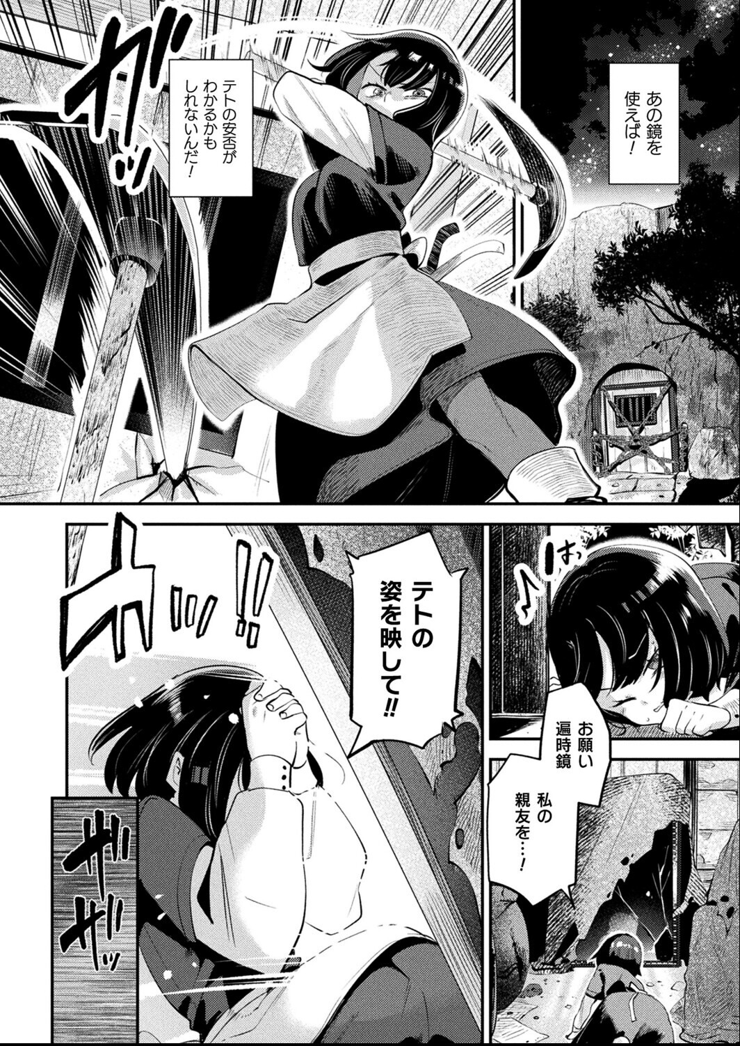 卑猥なビキニアーマーを装備させられた健気な女勇者がパーティの男たちに裏切られ睡姦&妊娠!? その後身重の身体でひとり魔王に立ち向かうも、今度は触手に囚われ地獄の悪堕ち出産アクメ! 女勇者テトを幼馴染に持つ村娘レイナは、旅立ったテトの活躍の報せが急に届かなくなったことに不安を覚え、昔ふたりで見つけた、頭に浮かべた相手の過去と未来を見通せるという「遍時鏡」の存在を思い出す。 藁にも縋る気持ちで鏡にテトのことを念じると無事に効果は発動し、そこには懐かしい幼馴染の少女の姿が映し出されていた。 だが鏡の中のテトは何故か全裸に近い格好で王の前に跪いており、さらにその王は触手蠢く悍ましい装備品を手に携えていて……。