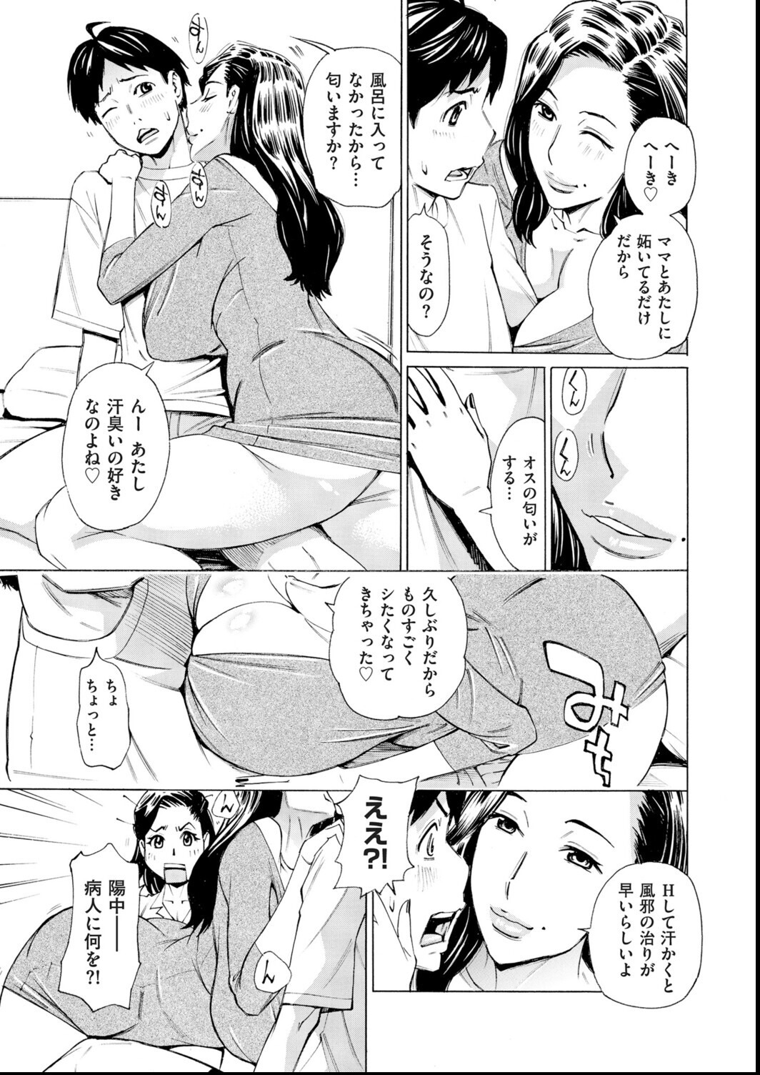 僕が風邪で会社を休んで四日目。 もうだいぶ良くなったタイミングで、 福良課長(僕の恋人です!)がお見舞いに来てくれました。 でもなぜか妹の朝陽さん(セフレ?)も一緒でした。 そして朝陽さんは僕の汗臭い体の匂いで 発情したようで、急に僕に迫ってきたのです。 彼女は「みんなでエロいことしよーよ」 なんて言ってノリノリで福良課長の 小さい頃のエロ話を始めたのですが、 課長は恥ずかしがって部屋から出ていってしまいました。 僕たちの関係、どうなるのォ〜!?