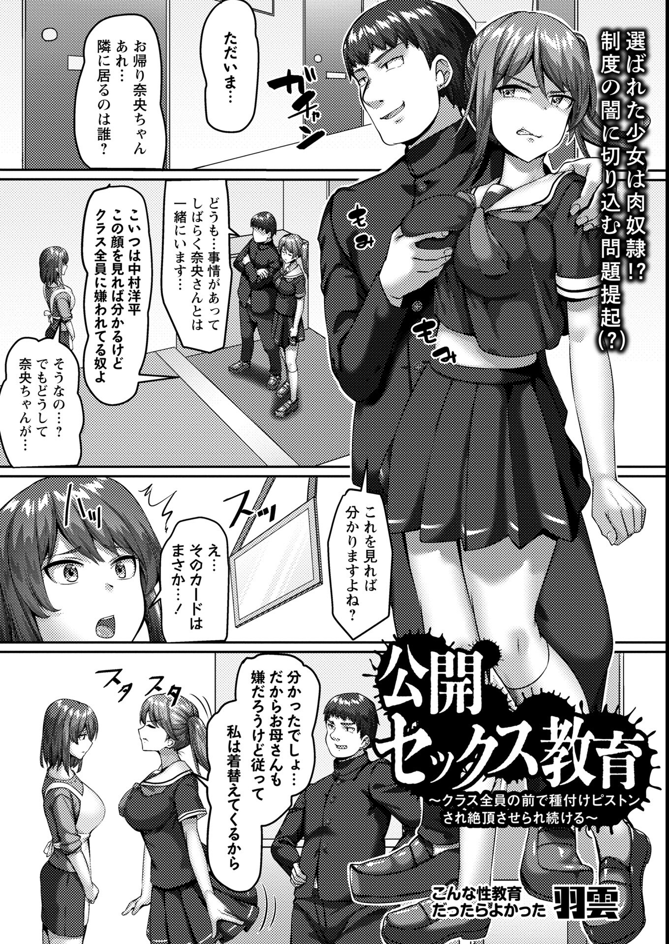 クラス全員の前で種付けピストンとか設定がブッ飛んでて最高!嫌われ者の男に指名されたギャルが衆人環視の中で感じちゃう展開がたまらん。羽雲先生のギャルの描き方がエロくて、おもちゃ責めから本番への流れもテンポ良い。制服のままヤられてるのもポイント高いし、エロ密度がすげぇ濃い!