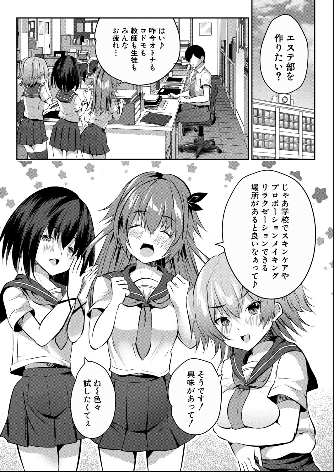 女子学生3人組の提案で新しい部活・エステ部を作る事になった。 相談を受けた男教師は彼女達の施術を体験する事になるが、その内容はエステではなくソーププレイだった! 勃起しているのがバレたけどセックスまですることになり、密着度は最高潮に!