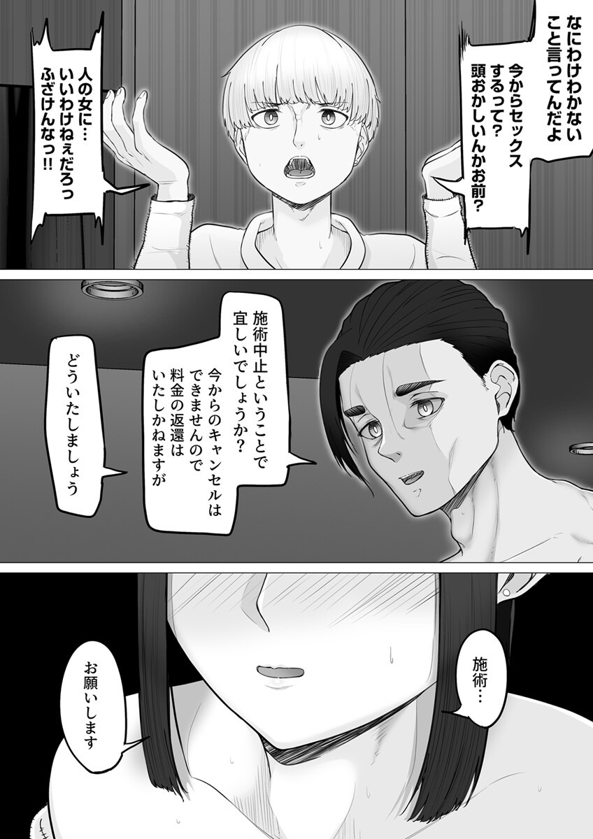 大学生のりょうは、彼女であるみきとのSEX中、許可なくコンドームを外し、中〇しをキメてしまった。怒ったみきをなだめる為に提案したのは、『女性の体内に残留する精〇を100%取り除く』と言うサービス。早速、手配するも、やってきたのは、ガタイの良い大男で…!?彼は触診と称して、みきのア〇コをクニクニとかき回す。その太くてごつい指は、みきのポイントを的確に刺激し、快楽へと浸らせた。そしてその立派な『施術棒』を、みきのナカに残った精〇を掻き出すべく奥までズッポリ挿入すると…!?太く長いソレは、彼氏が届かなかった気持ちいい所まで到達し、グリグリと動かされるたびに、みきはオーガズムを繰り返すのだった。