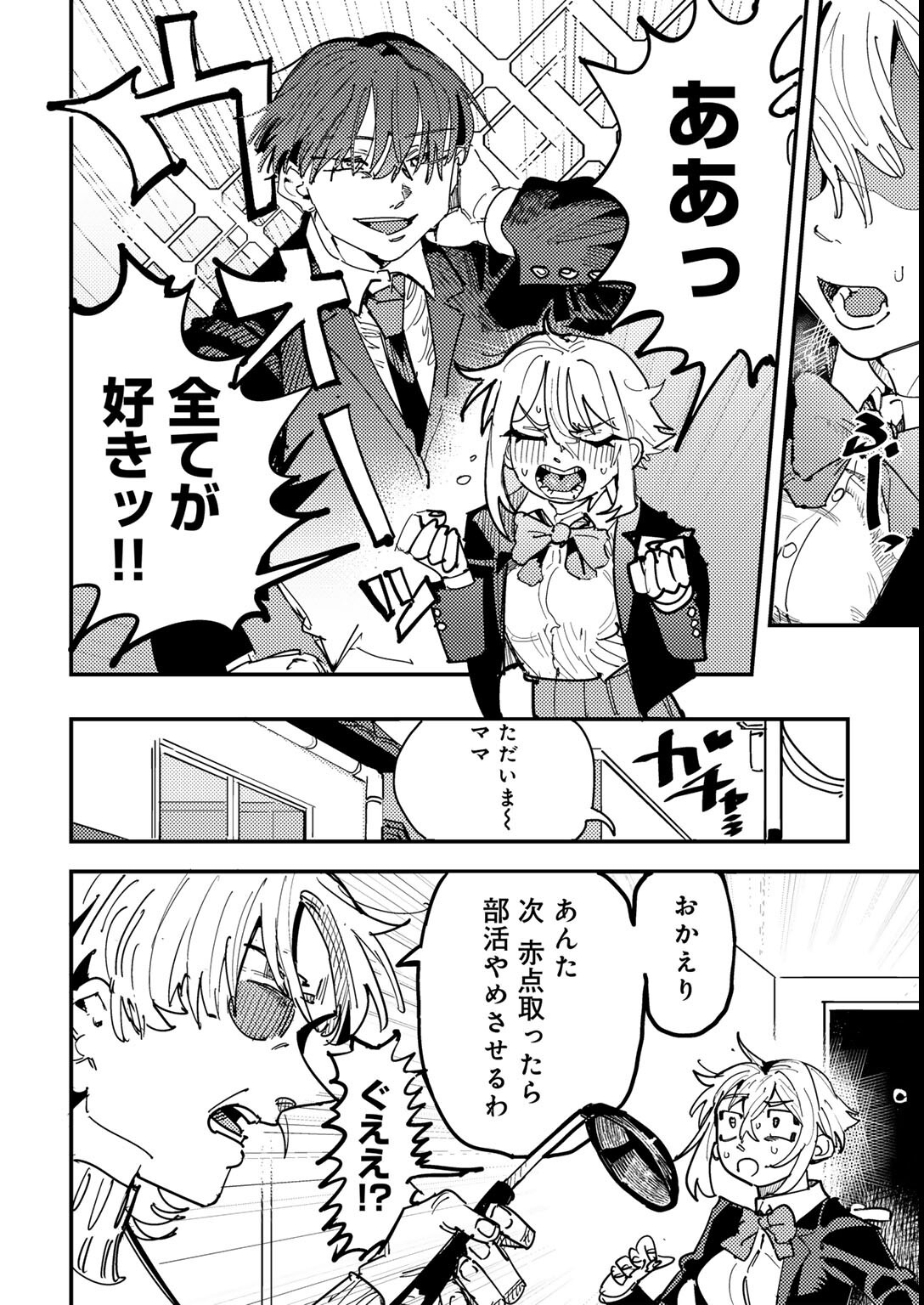 感情の誇張表現とコマ割りのダイナミズムが相乗効果を生んでいる。