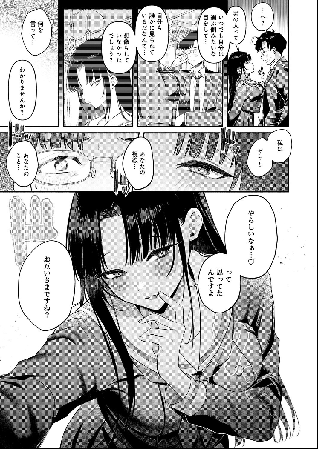 残業続きの毎日。人で溢れる満員電車。 唯一の癒しは、電車で見かける黒髪の美少女だった。 今日の電車はいつも以上に混んでいて、なんとその彼女が目の前に!? さらさらの髪。長いまつげ。小さな口。 近くで見ても美しい彼女に、思わずいやらしい視線を向けてしまう。 そんなとき、ばっちり目が合って…… 「さっきから私のこと… やらしい目で見てますよね?」 狼狽える俺を、彼女はそのまま駅の公衆トイレへと連れ込む。 「私はずっとあなたの視線…あなたのこと…やらしいなぁ…って思ってたんですよ お互い様ですね?」 超大型新人・みなとく先生熱筆☆ クール系強者美少女に責められSEX!