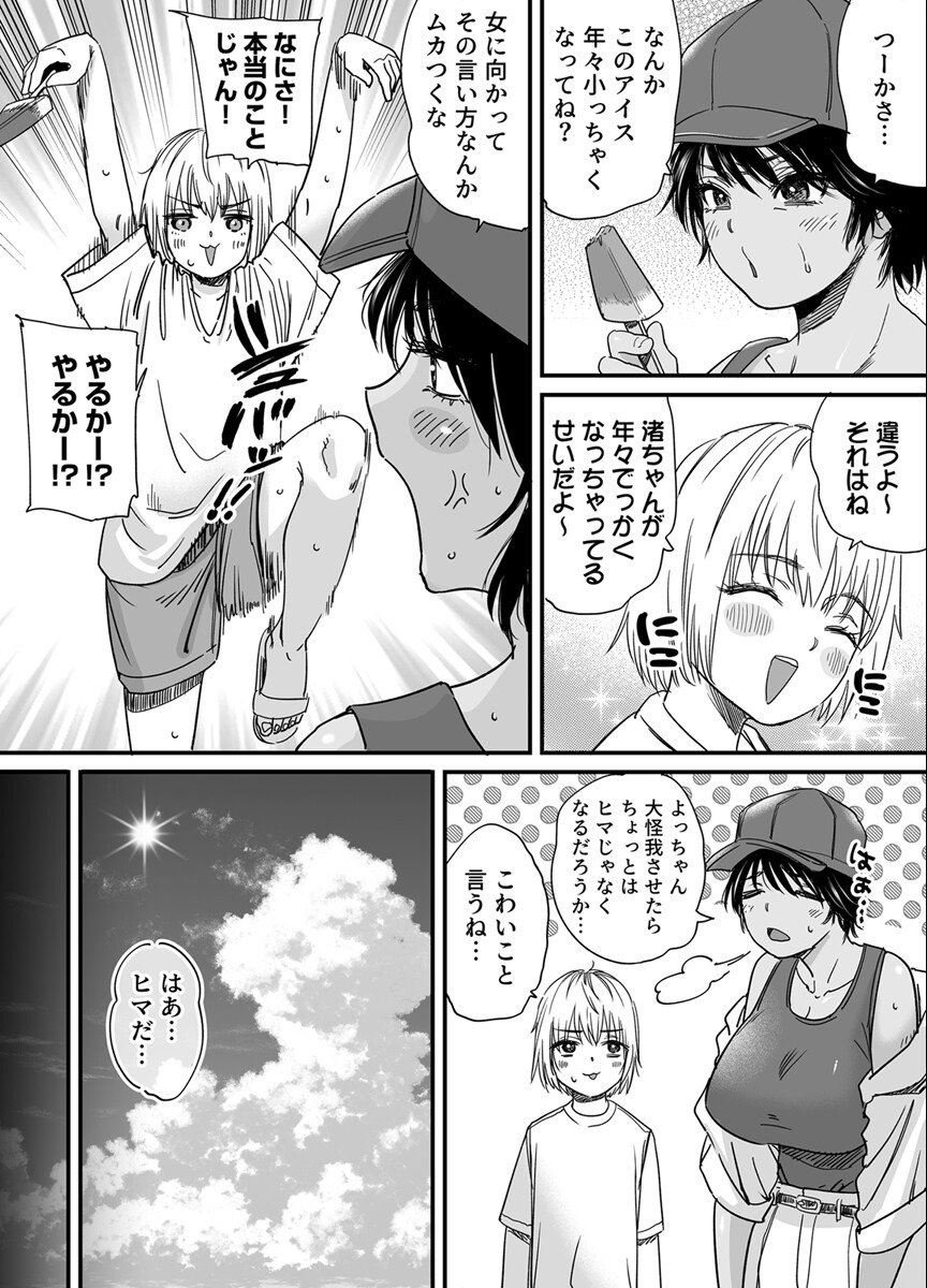二歳下の幼馴染のよっちゃんと一緒に学校へ通う渚ちゃんは、朝から興奮してしまったよっちゃんの性欲を発散してあげる。きっかけはひと月前、流れでセックスしたあの日。「ヤリたくなったらヤラせてやるよ」なんて軽く約束したせい…。それから二人は四六時中、発情セックス!ボーイッシュな渚ちゃんのことを女の子として扱ってくれるのはよっちゃんだけ!「いちゃラブセックスもしてあげるっっっ !」「はぁっ…はぁっ… 私…、女の子に生まれてよかったぁ…!」夏だ!褐色だ!爆乳ボーイッシュだ! いつも女の子扱いされなくても、セックスしてるときは最っ高にメスなんだよ!