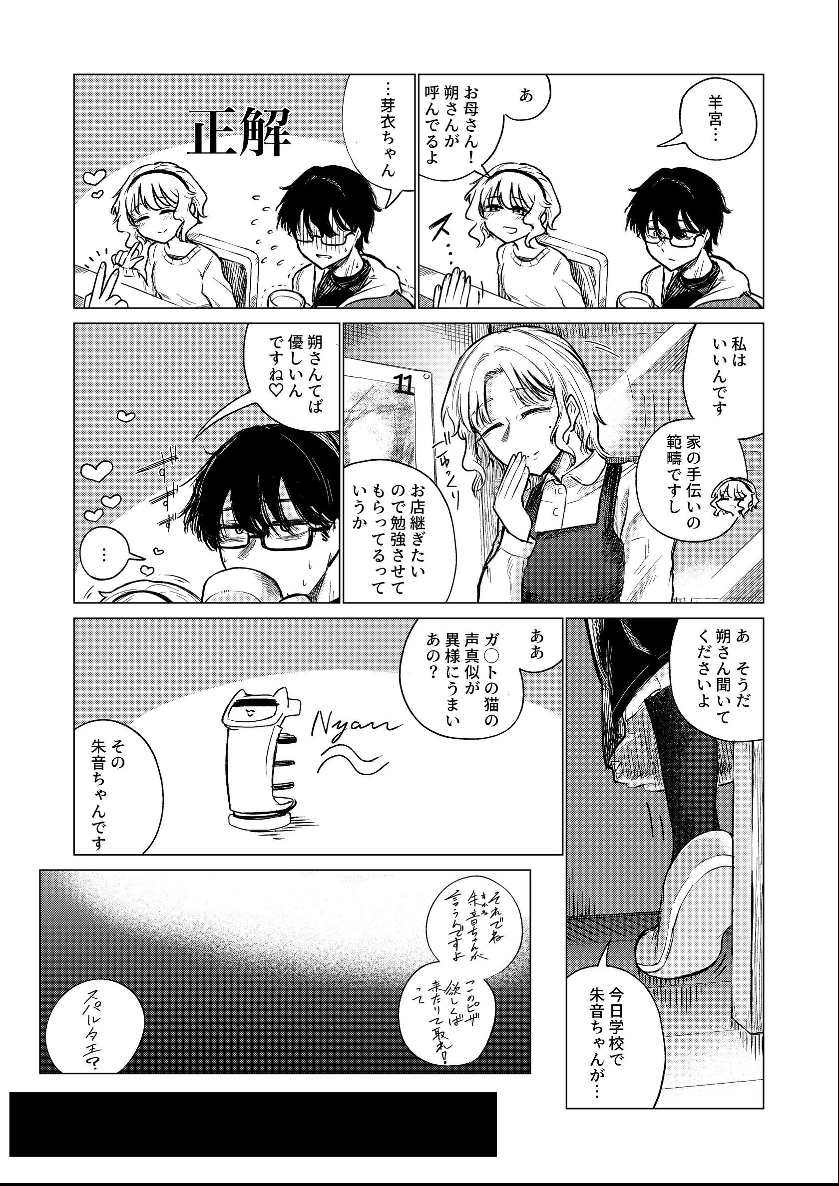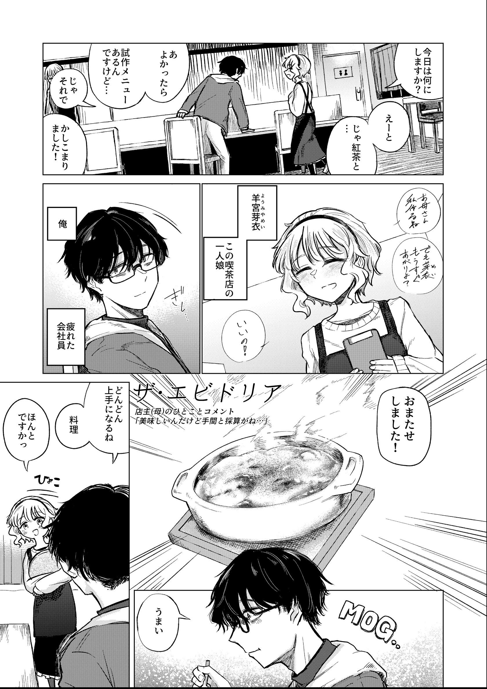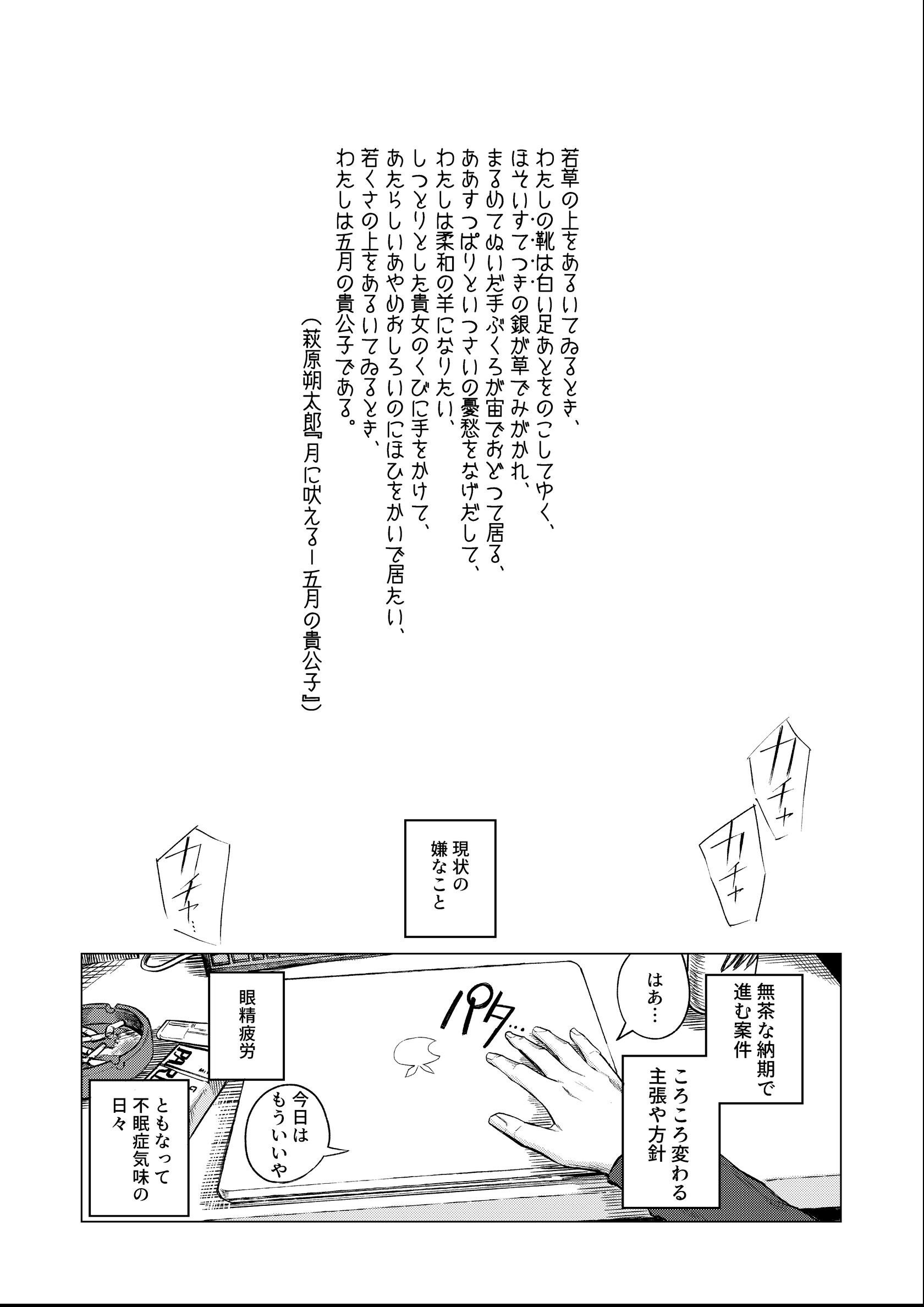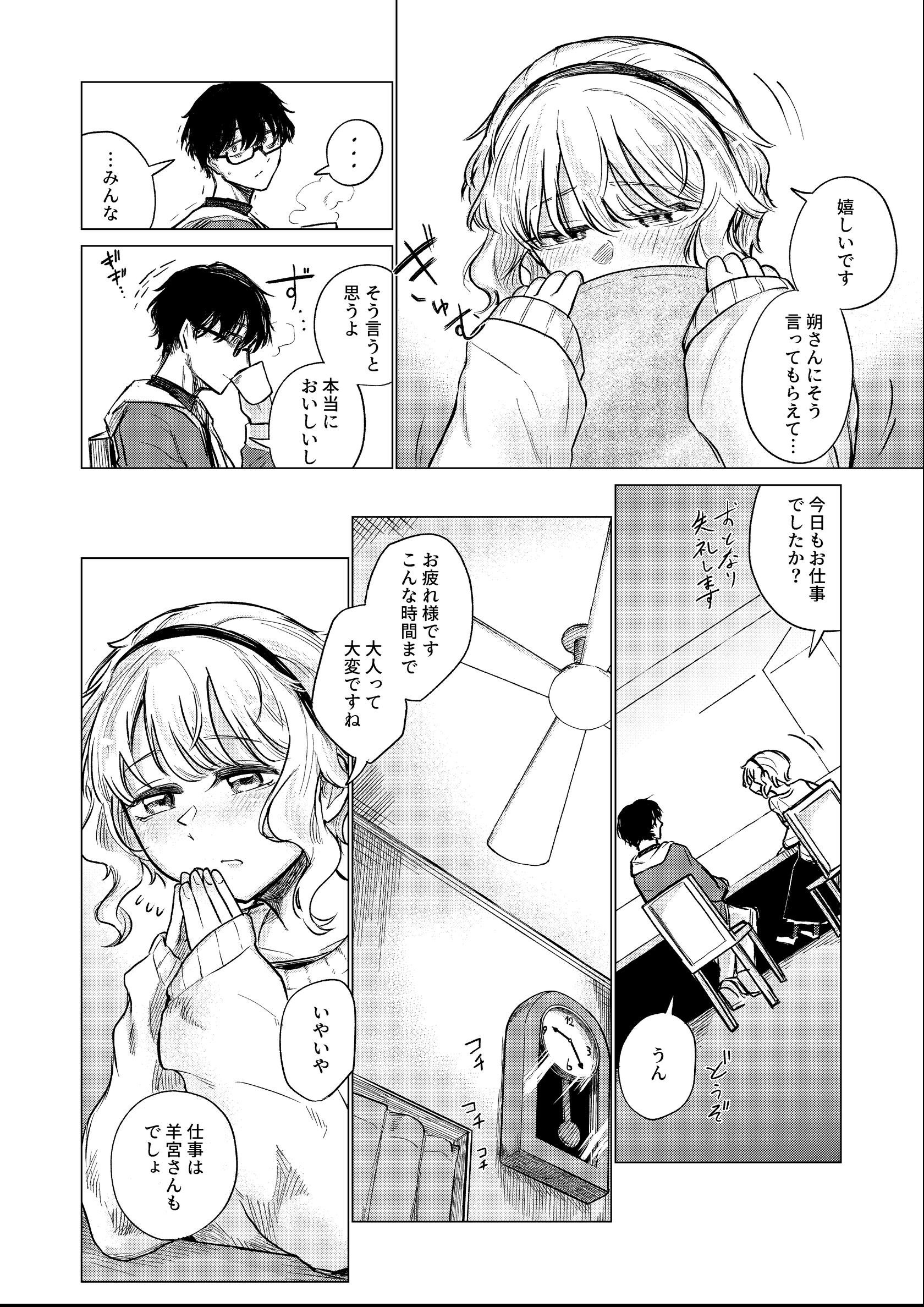 無茶な納期、二転三転する方針、眼精疲労。その他さまざまなストレスで不眠症気味の会社員、朔。 彼が心の拠り所にしている喫茶店の一人娘、芽衣。 朔は考える。 仕事がどれだけ辛くてもこの店があれば自分の中で折り合いをつけられると。 いい方にも悪い方にも踏み込みすぎず、現状維持ができる。 この子の前ではなんとか大人のフリができる。仕事がクソでも、うまく眠れなくても… そんな自己暗示を続けても、悲しみはそこここに積もる。 ちょっとした不運続きで限界が近づき、いい加減「大人」を取り繕えなくなってきた朔。 そんな彼の家を芽衣が訪れる。 誘う芽衣、残る理性で踏みとどまる朔。 彼を閉じ込める柵から解き放つための言葉を、彼女は口にする。 「私、子供じゃないから だから」 「朔さんも、大人でいようとしなくていいですから…」 49ページ