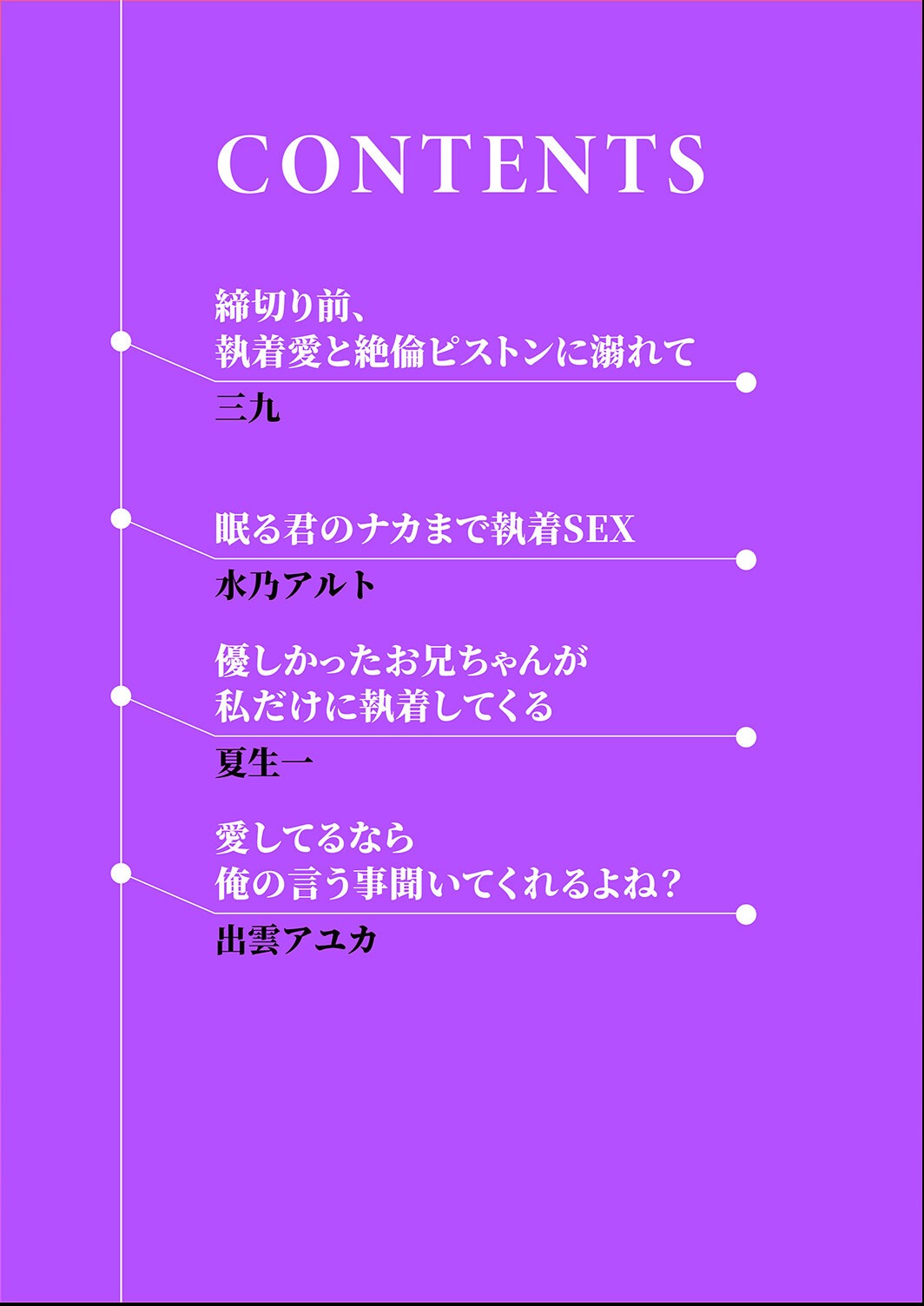 三九、水乃アルト、夏生一、出雲アユカと4名の作家によるオムニバス形式は、読者に多様なエロ表現を提供する構成と言えよう。執着男子というテーマで統一感を保ちつつ、各作家の個性が出ている。ただし複数作家ゆえに画風の統一感には欠ける面もある。OLや幼なじみなど、シチュエーションの幅を持たせた点は商品設計として賢明である。