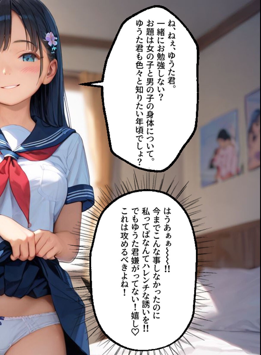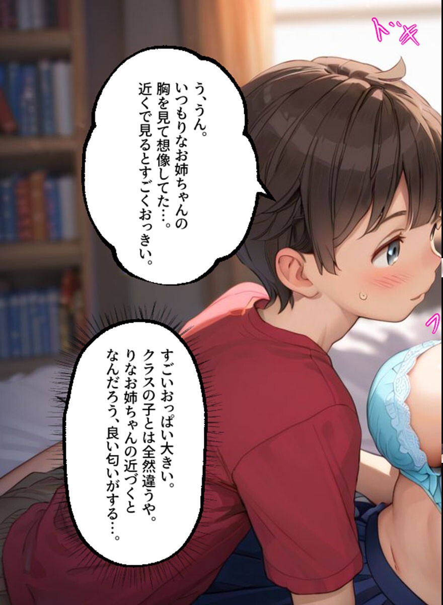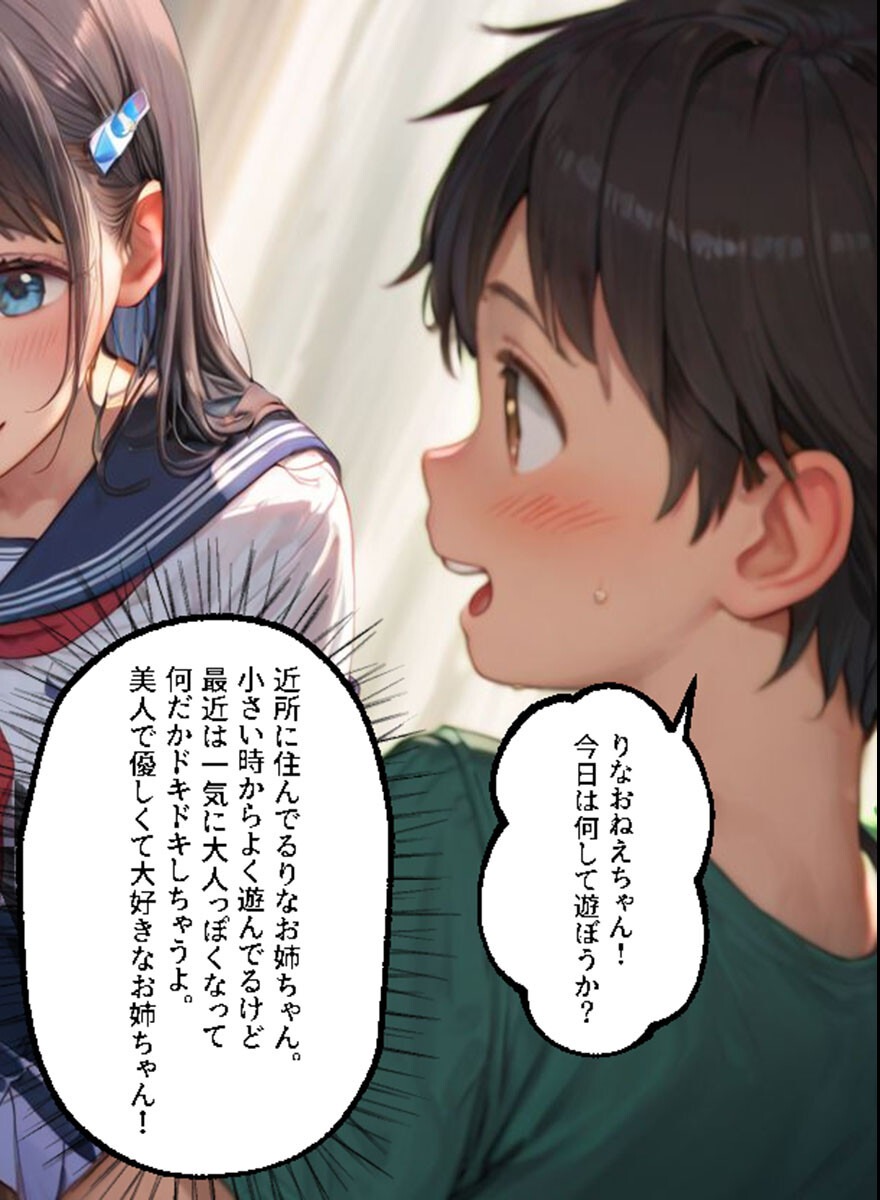 近所の優しいお姉さんとの秘密の関係って設定がもうたまらない!りなお姉ちゃんが「気持ちの高まりが止まらない」って言ってるのがドキドキするし、ゆうた君の純粋さとのコントラストが良い。フルカラーで甘い雰囲気が伝わってくるし、身体のお勉強っていう名目でエロに持っていく展開がナチュラルでいい。ラブラブあまあまの真骨頂!