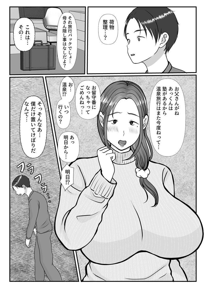 僕は、恋してるんだ、母さんに――秋斗は実の母との関係に悩んでいた。二年ほど前から母親への思いが止まらず、母の下着で抜くのが日課となっていた。「このパンティ、見覚えある?」母に呼び止められ、聞かれてしまう…今までのことは全てバレてたんだ…ある意味、チャンスなのかもしれない…この感情をもう抑えきれない!「母さん…僕の、彼女になってほしいんだ!」きっと振られる…そう思っていた矢先――「あっくんの気持ちを受け入れるわ」え…許してもらえた!?もしかして、母さんとヤレる!?――その夜、母は僕の前で裸になって…そのままアソコに手をのばす。更には大きすぎる胸でそれを包んで…!?もう後には戻れない…母さん、僕の全てを受け止めて!!