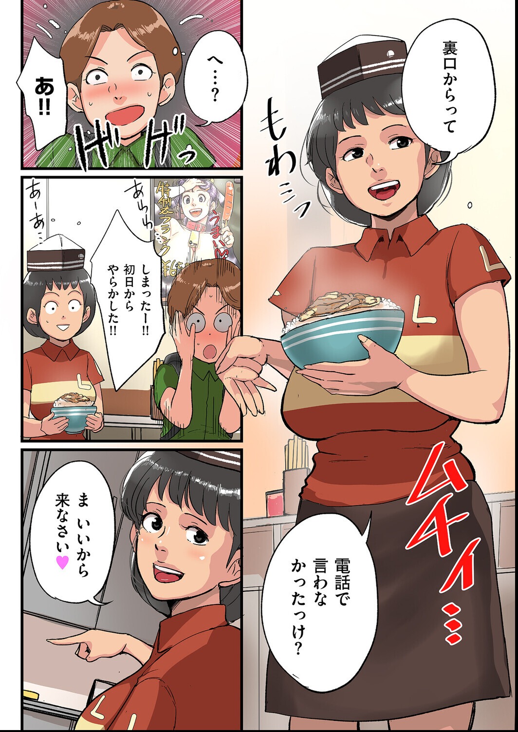 フルカラーの熟女痴女マジで最高!牛丼屋のトイレや厨房という場所でやるエロさがたまらない!杢臓先生の巨乳の色づきと質感がリアルすぎてヤバい!騎乗位シーンの躍動感と、パイズリのシーンの肌の質感が最高すぎる!
