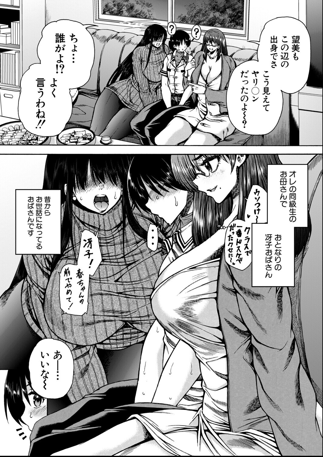 叔母と隣のおばさんに挟まれて童貞卒業っていうシチュエーションが、男の夢だよね。和原ヨウ先生の描く人妻キャラがムチムチで色気たっぷり。手コキから始まって段階を踏んでいく展開が丁寧で、初体験のドキドキ感がよく出てる。巨乳の描写も柔らかさが伝わってきていいんだよ
