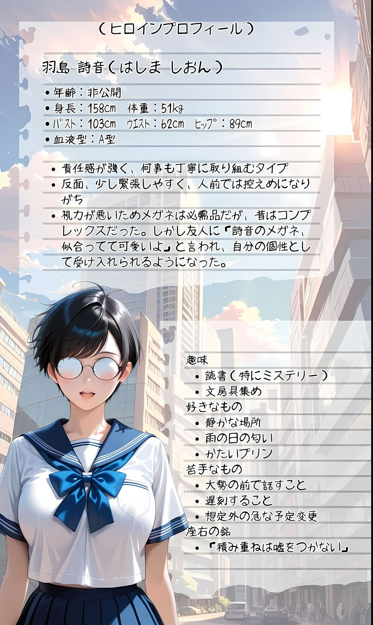 サークル メコ神がお送りする「おじさんち〇ぽに沼る話」 の新たなシリーズ「水着撮影会のはずが…」の第2弾です! 前作同様にパワーアップした没入感と迫力のセックスシーンはそのままに、コメントのご意見等を参考にしてセリフを大幅に増やしました。 しっかりとストーリー仕立てにしてますのでお愉しみ頂けると思います! <あらすじ> メガネ巨乳女学生「詩音」が家を出るところから物語は始まります。 学園に遅刻しそうな詩音はダッシュで学園に向かう途中、木陰からのっそりと出てきたおぢさんと正面衝突! 幸いどちらにもケガはなく、急いでその場から走り去る詩音。 現場では壊れたカメラを見て立ち尽くすおぢさんの姿。 真面目メガネ娘 詩音と水着撮影が趣味のおぢさん、何もなければ絶対に交わることのない二人が事故をきっかけに交錯していく… <ヒロイン紹介> 名前:羽島 詩音(はしま しおん) ・身長:158cm 体重:51kg ・バスト:103cm ウエスト:62cm ヒップ:89cm ・血液型:A型 趣味:読書(特にミステリー)、文房具集め 好きなもの:静かな場所、雨の日の匂い、かたいプリン 苦手なもの:大勢の前で話すこと、遅刻すること、想定外の急な予定変更 座右の銘:「積み重ねは嘘をつかない」 責任感が強く、何事も丁寧に取り組むタイプ 反面、少し緊張しやすく、人前では控えめになりがち 【注意事項】 ※本作品のシチュエーションは全てフィクションです。登場する人物や設定等は、すべて架空のものとなります。 ※本作品はAIによる生成画像を使用して制作しております。 ※犯罪、その他違法行為を美化または助長する意図はございません。 ※本作品は、原作の本文・画像等を、権利者様から許諾を頂いております。 (C)ラビットフット/メコ神 【純朴巨乳美●●パイ●リ編】水着撮影会のはずが、いつのまにかおぢさんち〇ぽに沼る話part2