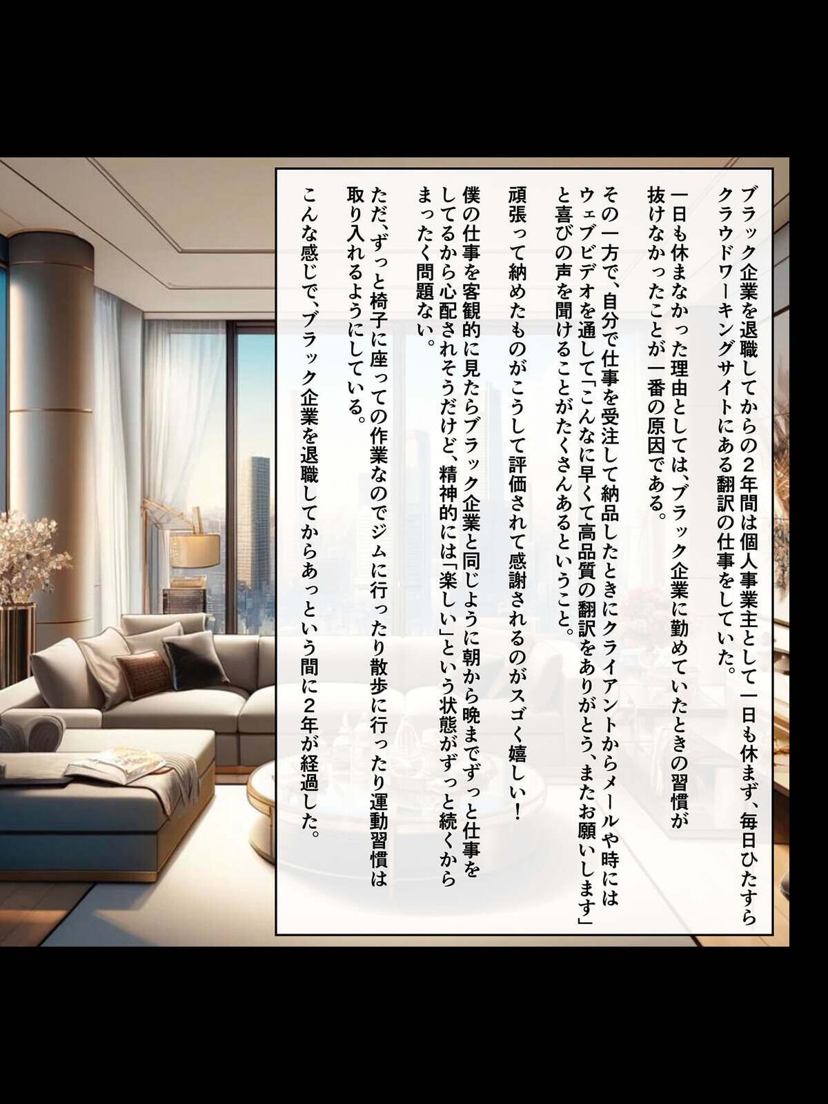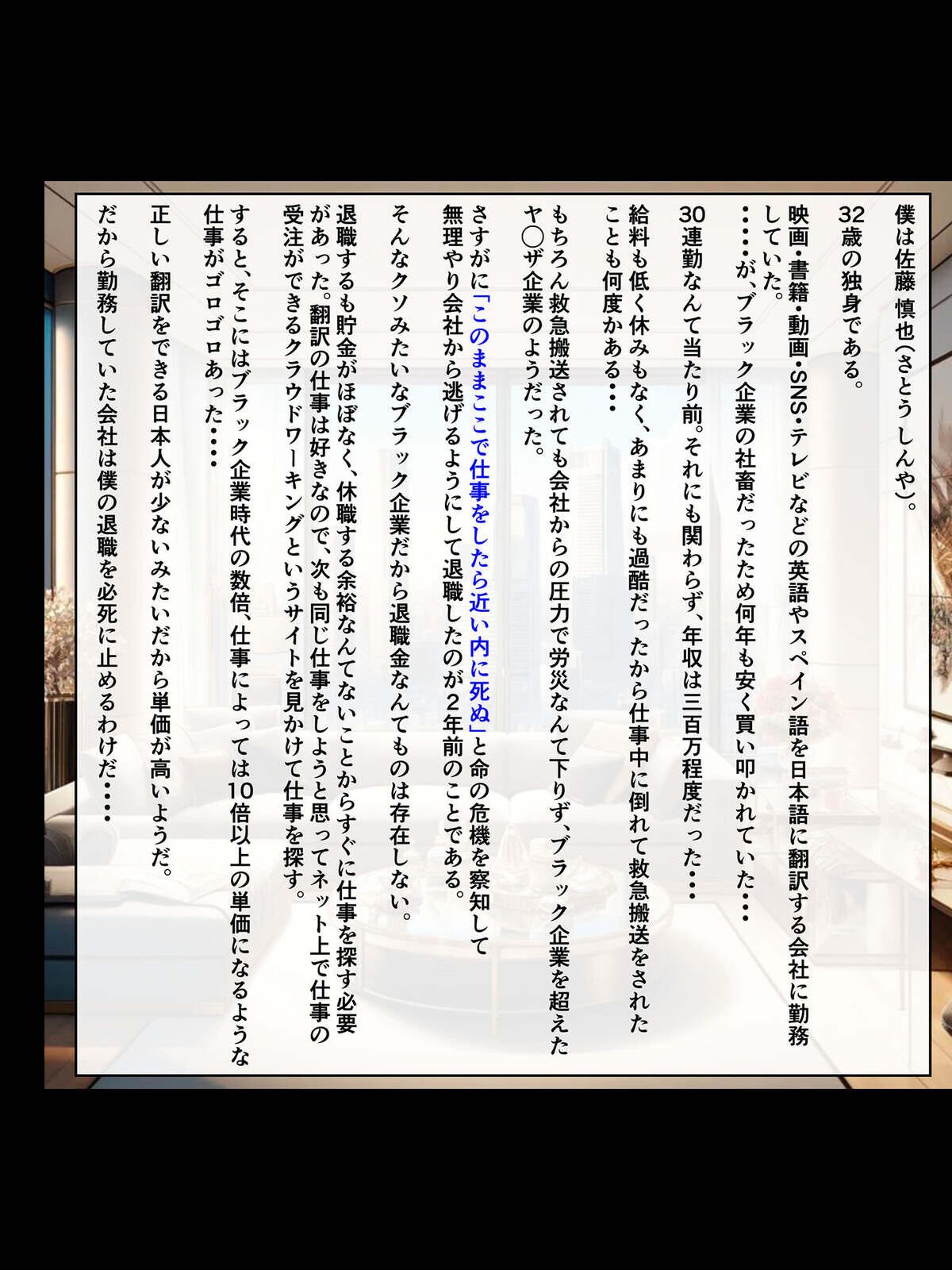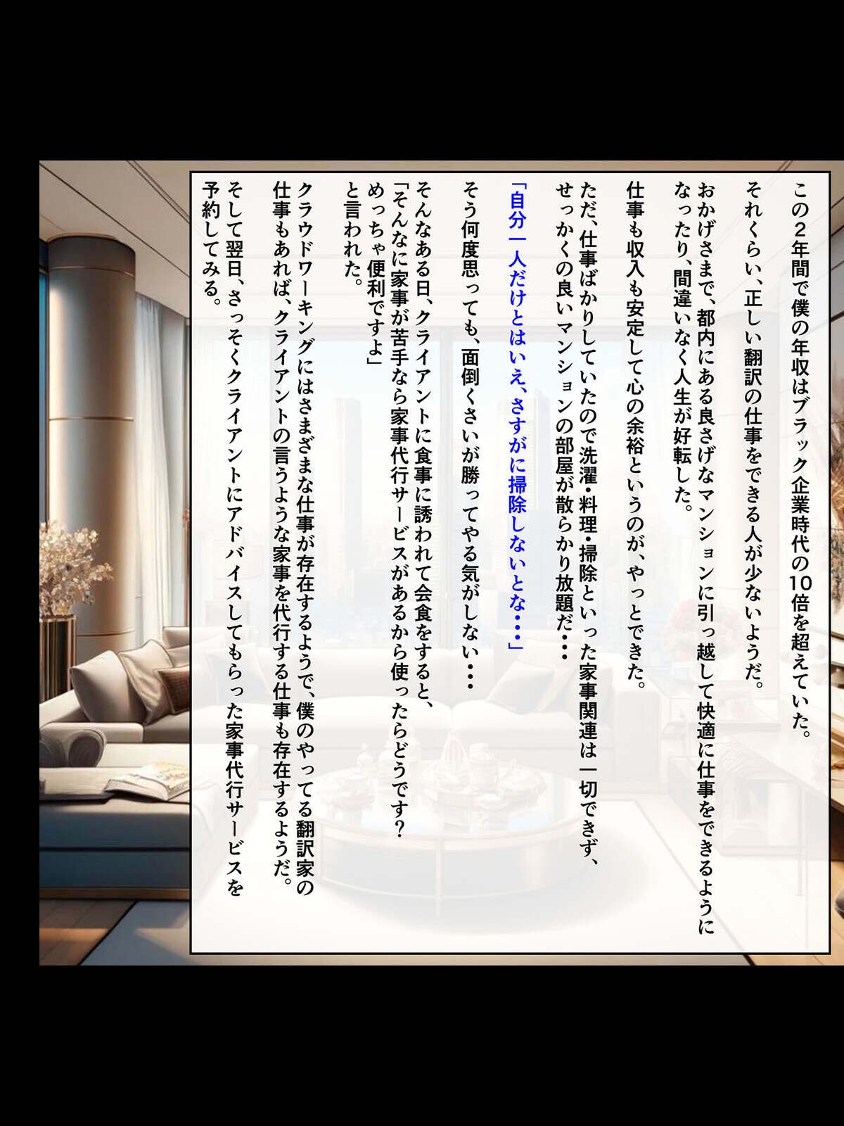 人気シリーズ4タイトルを収録! ■あらすじ 主人公である佐藤慎也(さとう しんや)は長年ブラック企業に勤務していた。 過労によって救急搬送されることもあり命の危機を感じた慎也は無理やりブラック企業を退職して個人で翻訳家の仕事をしていた。 ブラック企業を退職してからは自分の生活費を稼ぐために2年もの間を一日も休まず仕事をして、それなりの稼ぎと貯金を得ることができた。 しかし、仕事ばかりしていたので部屋が散らかり放題で家事という家事がまったくできない。 とある日、クライアントから「家事代行というサービスがあるから使ってみれば?」と言われ、家事ができない慎也にとってはありがたかった。 さっそく家事代行に依頼した当日、そこに現れたのは金髪褐色ギャルの木村玲奈(きむら れな)だった。 見た目は完全にギャルなのに礼儀正しく仕事ができる玲奈。 そんな玲奈との出会いから物語は始まる... 【注意事項】 ※本作品に登場する人物は全て人工知能(AI)によって生成されたイラストであり、実在しません。 ※本作品はAI生成画像のため、手足など細かな部分が乱れている場合があります。 ※本作品に登場する人物は全員20歳以上です。 ※犯罪、その他違法行為を美化または助長する意図はございません。 ■収録作品 クズ男たちからギャル母娘を寝取って幸せにするお話1〜長女編〜 クズ男たちからギャル母娘を寝取って幸せにするお話2〜次女と母編〜 クズ男たちからギャル母娘を寝取って幸せにするお話3〜新婚旅行編〜 クズ男たちからギャル母娘を寝取って幸せにするお話4〜ボテ腹エッチ編〜 ※収録書籍をご確認の上、単巻、他合本シリーズとの重複購入にご注意ください。 ※本作品は、原作の本文・画像等を、権利者様から許諾を頂いております。 (C)ラビットフット/ハレノヒ クズ男たちからギャル母娘を寝取って幸せにするお話1〜長女編〜