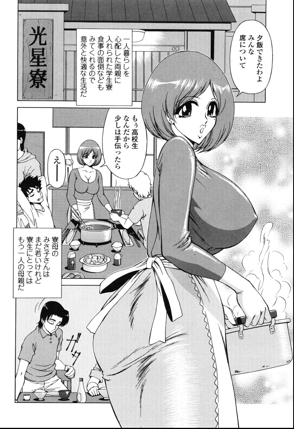 学生寮という閉鎖的な空間設定が、夜の親密さを効果的に演出していると言えよう。未亡人という背景がキャラクターに内面的な奥行きを与え、裸エプロンという視覚的なモチーフが母性と色気の中間領域を巧みに表現している。ともかず零の巨乳描写は質量感と柔軟さの表現において確かな技術力を示しており、騎乗位シーンの構図も計算されている