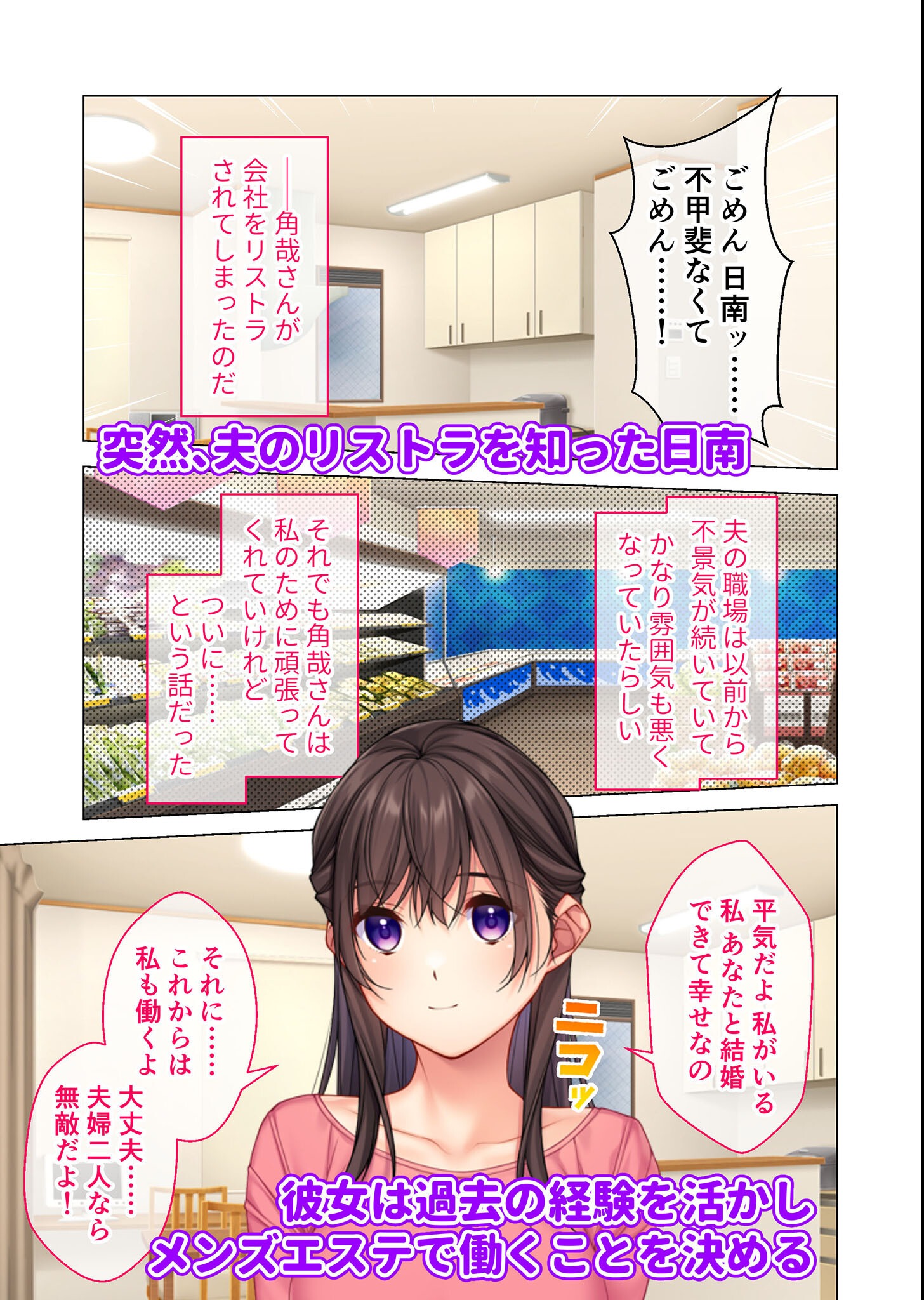 夫がリストラされてメンズエステで働く妻が常連客に堕とされる展開は王道なんだけど丁寧に描かれてるんだよね。フルカラーで日南のキャラが魅力的に描かれてて、737円でこのボリュームなら十分コスパいいよ。コマ割りもテンポがいい。