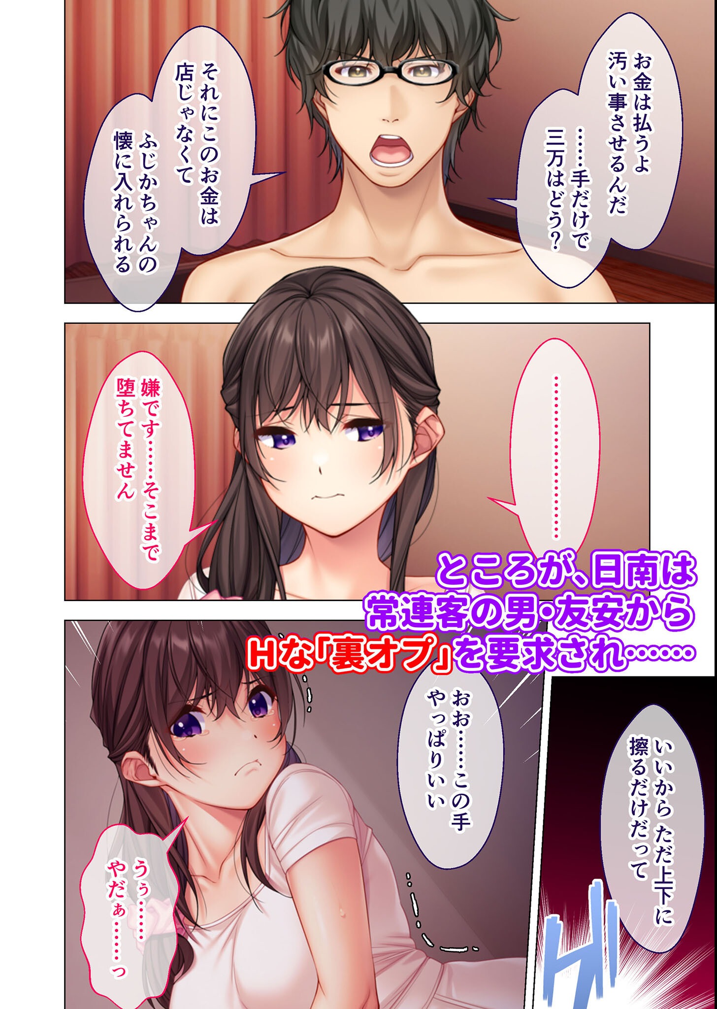 河渕角哉とその妻・日南は、平凡ながら幸せな結婚生活を送っていた。 そんなある日、角哉がリストラに遭い、仕事を辞めざるを得なくなってしまう。 夫を支えるため、自らも働くことを決意した日南は過去の経験を活かし、 かつての同僚から紹介されたメンズエステのお世話になることに。 その店はいわゆる健全店で、比較的平和なお店――のはずだった。 しかし、新人である日南を指名して以来、常連客となった友安秀世は 彼女にエッチな「裏オプション」を提案。 夫への罪悪感を抱きながらも、追加収入と「本番なし」という言葉に惹かれ、 日南はその提案を受け入れてしまうのだった。 それ以降、裏オプの内容は次第に激しさを増していき……!? --- ※本作品は、原作の本文・画像等を、権利者様から許諾を頂いております。 (C)どろっぷす!/アトリエさくら ---
