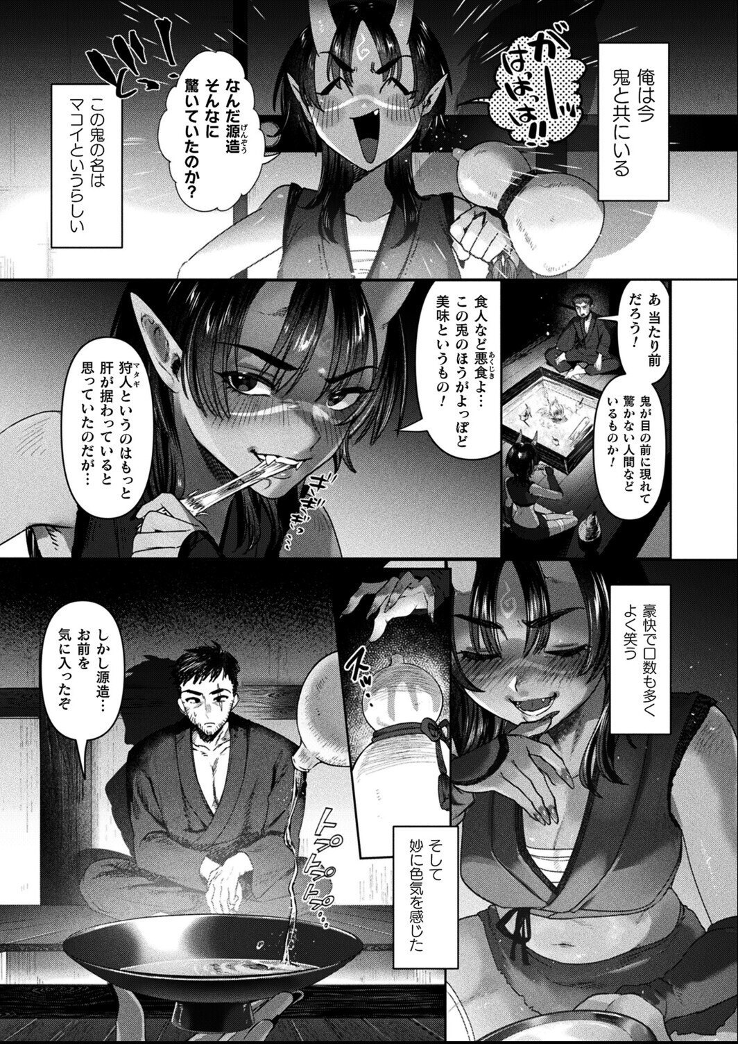 褐色鬼娘とマタギのなりゆき性交! マタギの源造は吹雪により山から帰れなくなり山間にある一軒の家へ訪れる。 そこは鬼娘のマコイが住む家であり、食に困っていた彼女は彼から提供された肉でさっそく酒盛りをはじめ、源造も勧められた秘蔵の酒をひと息に飲み干すが、酒の強烈さに気を失ってしまう。 その後目覚めた彼は寝入ったマコイの褐色肌に惹かれて自慰に耽るものの、目覚めた彼女に精液をぶっかけてしまい、動揺を隠せずにいた。 しかしマコイは酒が悪さをした詫びと言って源造に接吻を迫り……。