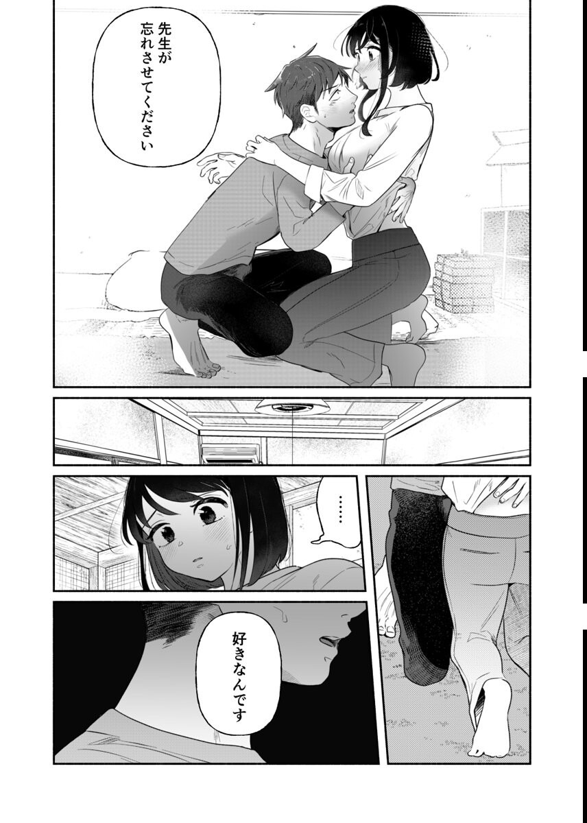 アパートの隣から聞こえる好きだった先生の淫らな声という設定が読んでいてドキドキするね。夫に激しく突き上げられている先生の声を隣室で聴くしかない主人公の切なさと興奮の描写が上手い。伊香ほたるの人妻先生描写は豊満で表情も艶っぽく、220円で読めるコスパの高い単話だよ。