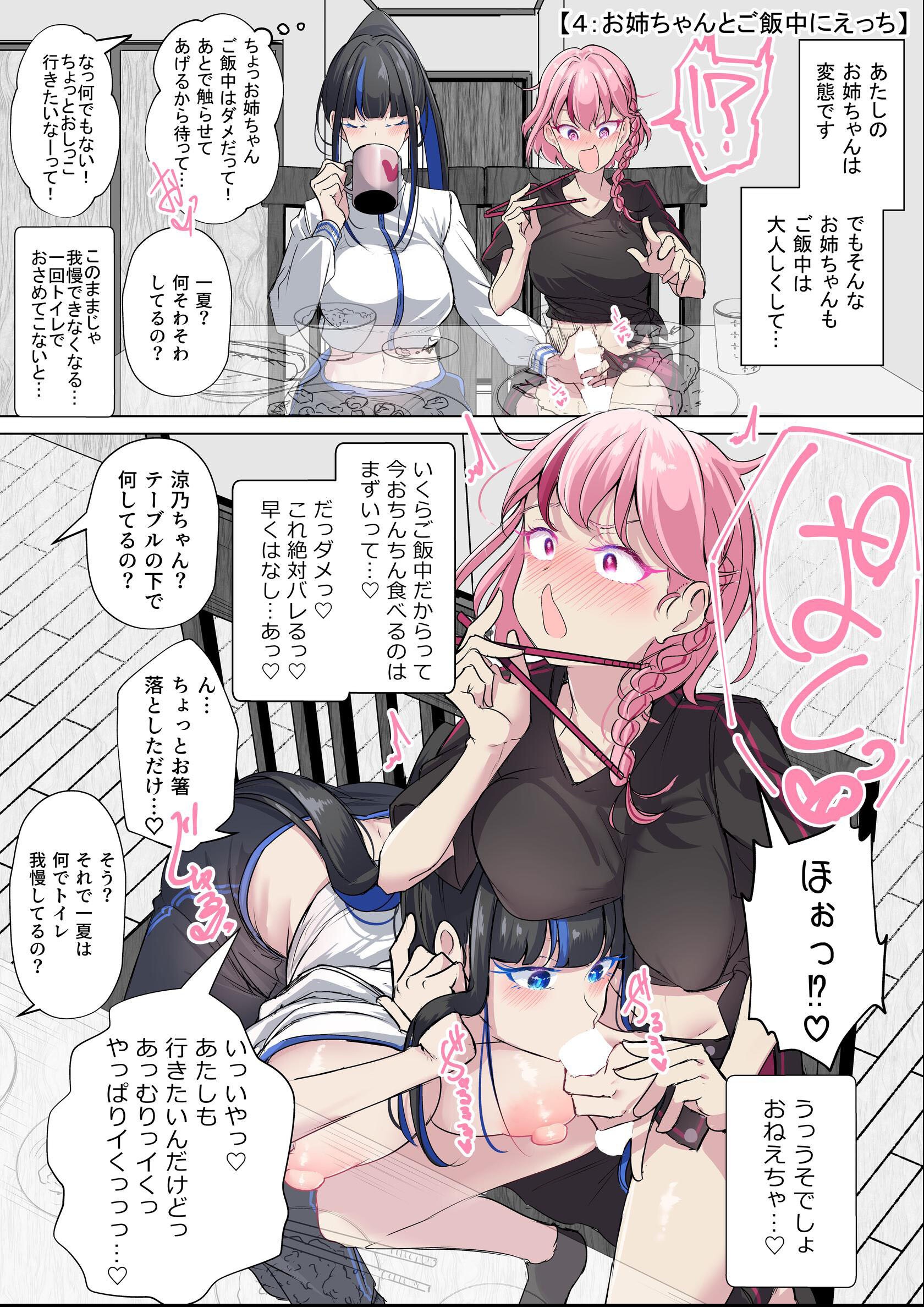 ふたなりの妹、一夏(いちか)のことが 大好きすぎる変態巨乳お姉ちゃん、涼乃(すずの)が、 我慢できずにいつでもどこでも妹ちゃんを襲って えっちしまくる仲良し姉妹のお話です。 基本カラー1p漫画です。(キャラのみカラー) セリフ差分で各話のページが増えたりしています。 ○基本ページ 第1話〜第40話 全219p 部屋でえっちしたりご飯中におちんちん食べたり エレベーターでえっちしたり学校でえっちしたり 寝てるお姉ちゃんでパイズリしたり プリでどんどん服脱いだり脱衣カラオケしたりと とにかくいろんな場所でえっちしまくる仲良し姉妹を どうぞ見守ってください。