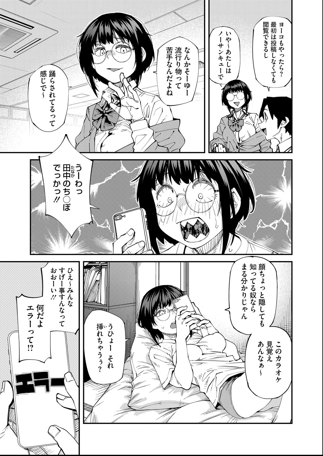 紙魚丸先生の描く眼鏡巨乳JKがエロすぎてやばい!承認欲求でどんどん過激になっていく展開がテンポ良くて、ハード系好きにはたまらん内容。アプリに煽られて際限なくエスカレートしていく構図が現代的で面白いし、絵の上手さが全てのシーンをハイクオリティにしてる。220円でこの画力は安すぎる