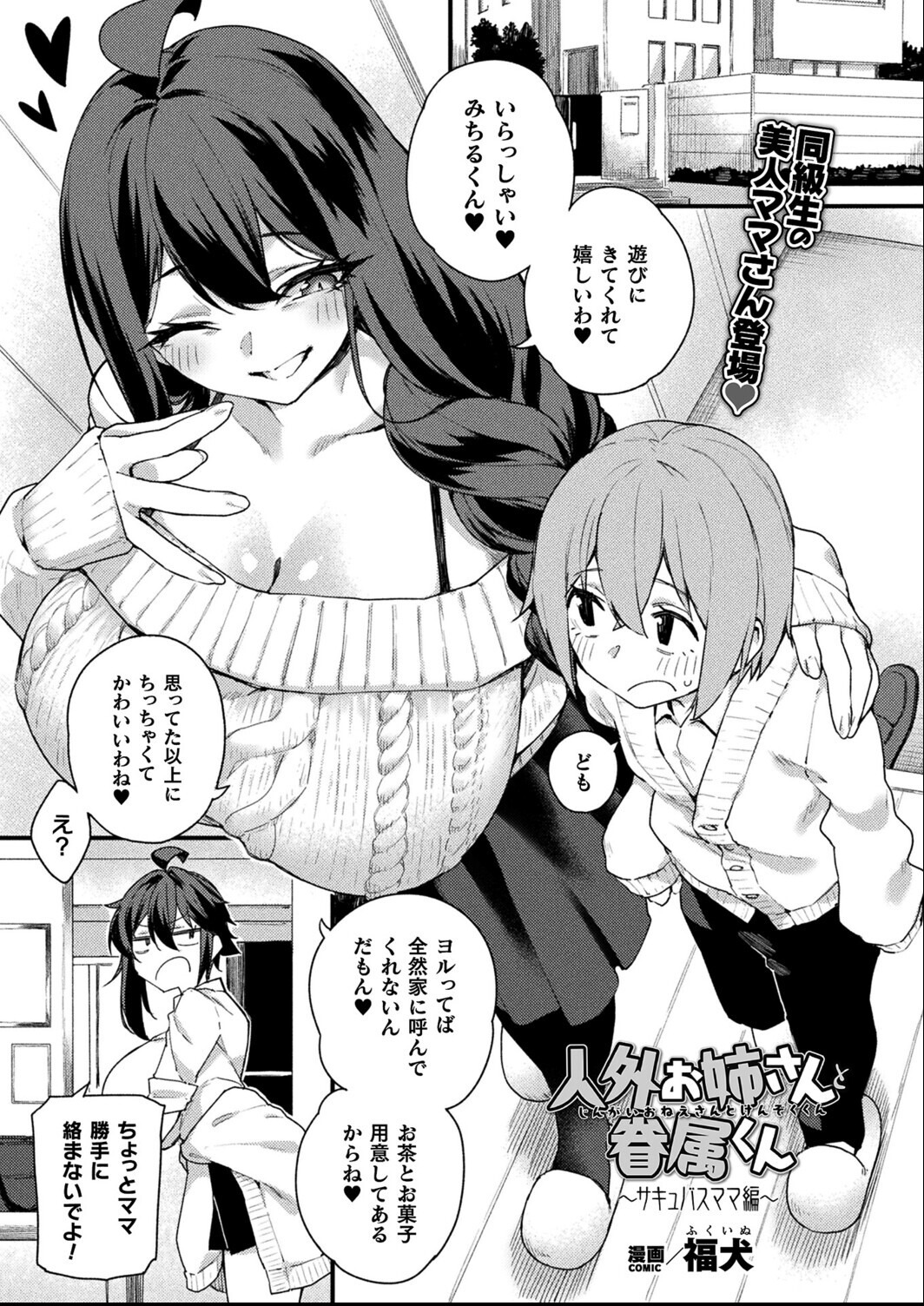 人外お姉さんの搾精シリーズ最終話は、同級生のママさんと甘やかしHからハーレム4PH! サキュバスのヨルに一目惚れされた少年・みちるは、学園に転入してきた彼女の眷属として連日搾精され続ける日々を送っていた。 さらに、同じ学園に通う褐色肌のデーモン・キアラからも標的にされ、ヨルとキアラの間で常に翻弄されているみちる。 そんなある日、みちるはヨルから自宅へ招待されるが、そこへキアラが押しかけ、二人はみちるを巡って激しい対立を始める。 みちるはヨルママと二人の時間を過ごすこととなるが、ヨルとの関係を羨ましく思う彼女がメスの本能を抑えきれず、甘く淫らな誘惑を仕掛けてくる。 流されるまま誘いに応じたみちるは、彼女の豊満な身体に全身を包み込まれ、ねっとりニプルファックであっという間に絶頂を迎える。 それでも収まらない興奮に、みちるはヨルママの乳首を吸う赤ちゃんプレイに没頭していくと、 口に含んだ精液を味わいますます昂るヨルママが挿入を促していき――。
