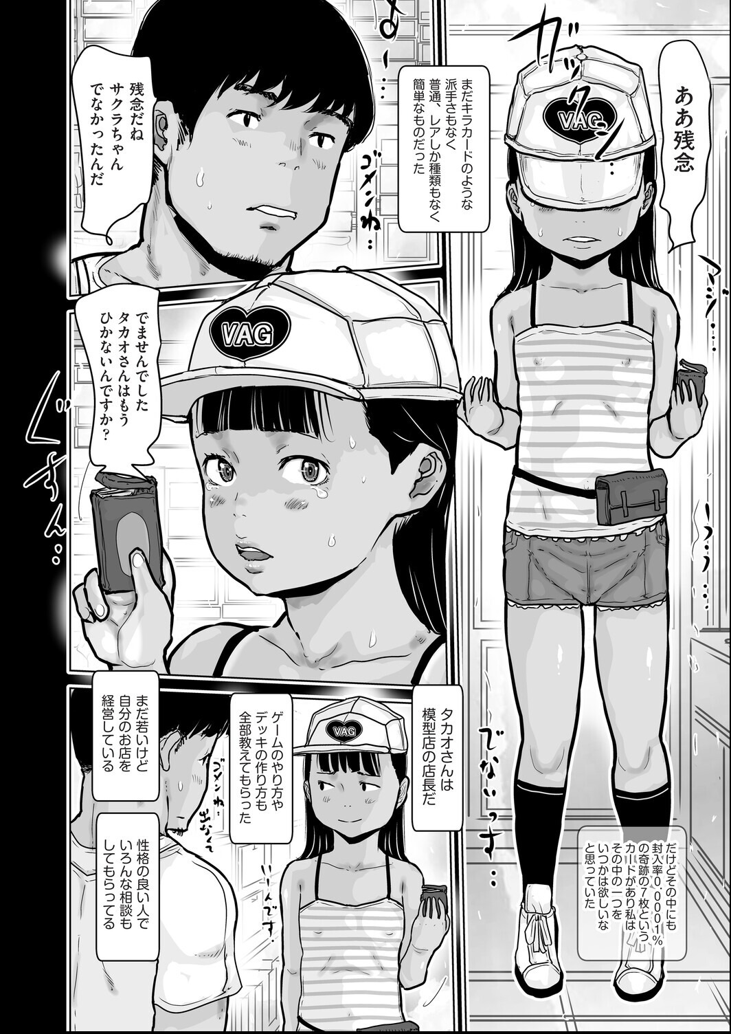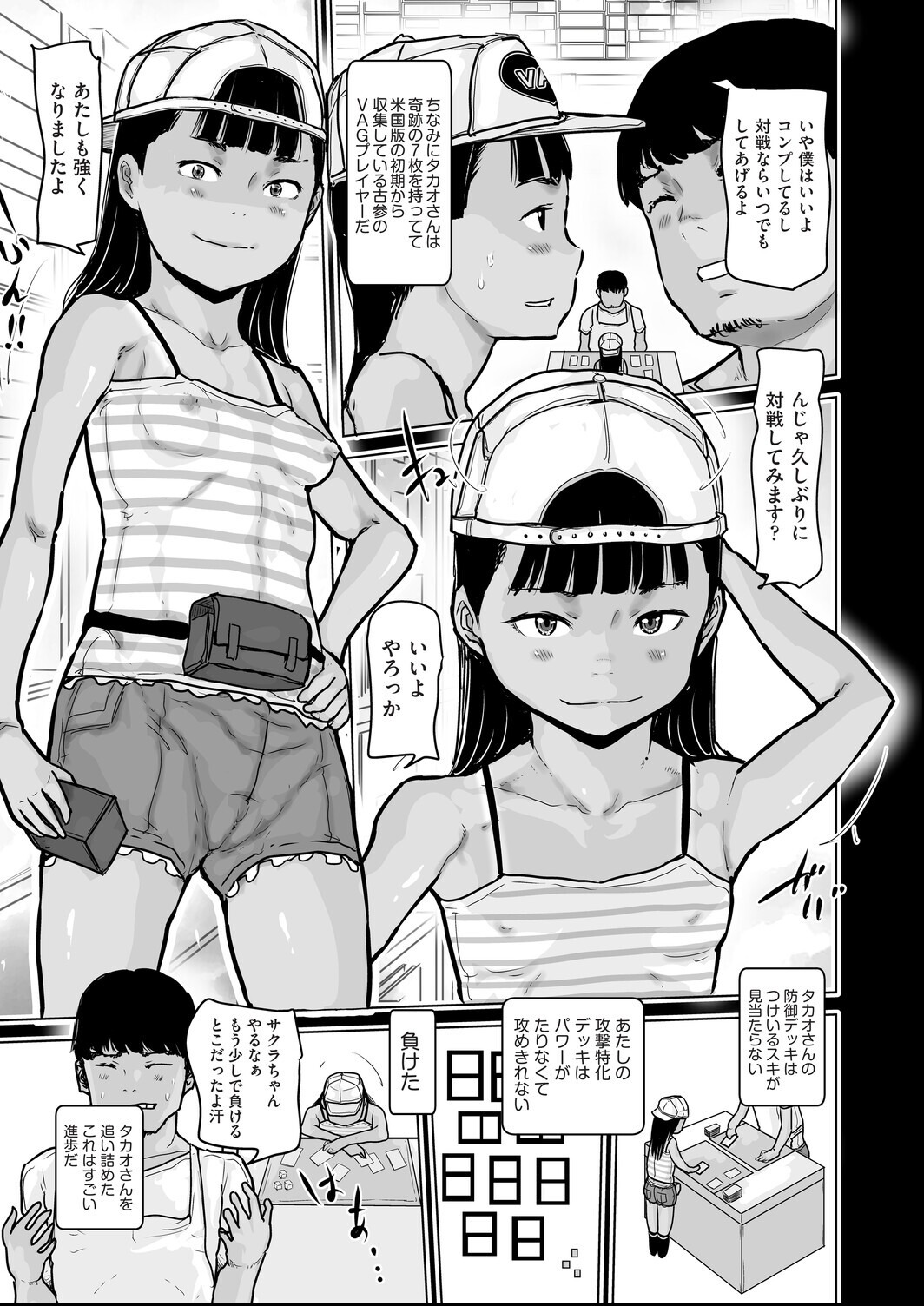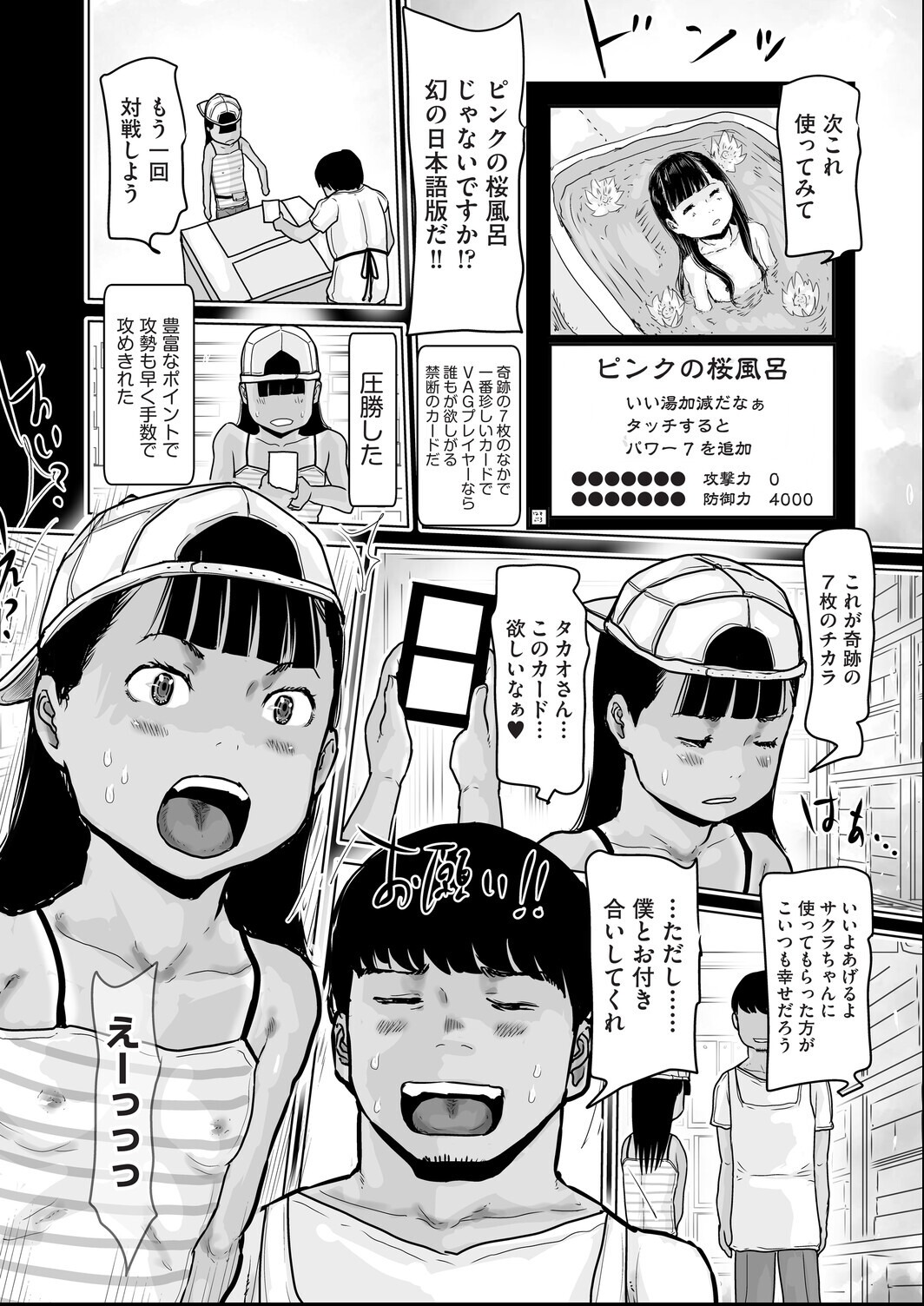 カードゲームのレアカード欲しさにお店に通うようになり店長のタカオと仲良くなったサクラちゃん。カードゲームで何度も対戦するがどうしてもタカオには勝てない。タカオは奇跡の7枚というレアカードも持っていてソレを欲しがっているサクラちゃんにカードをあげる条件でプロポーズ!二人はカードの対戦そっちのけで毎日セックス対戦を続けている!?