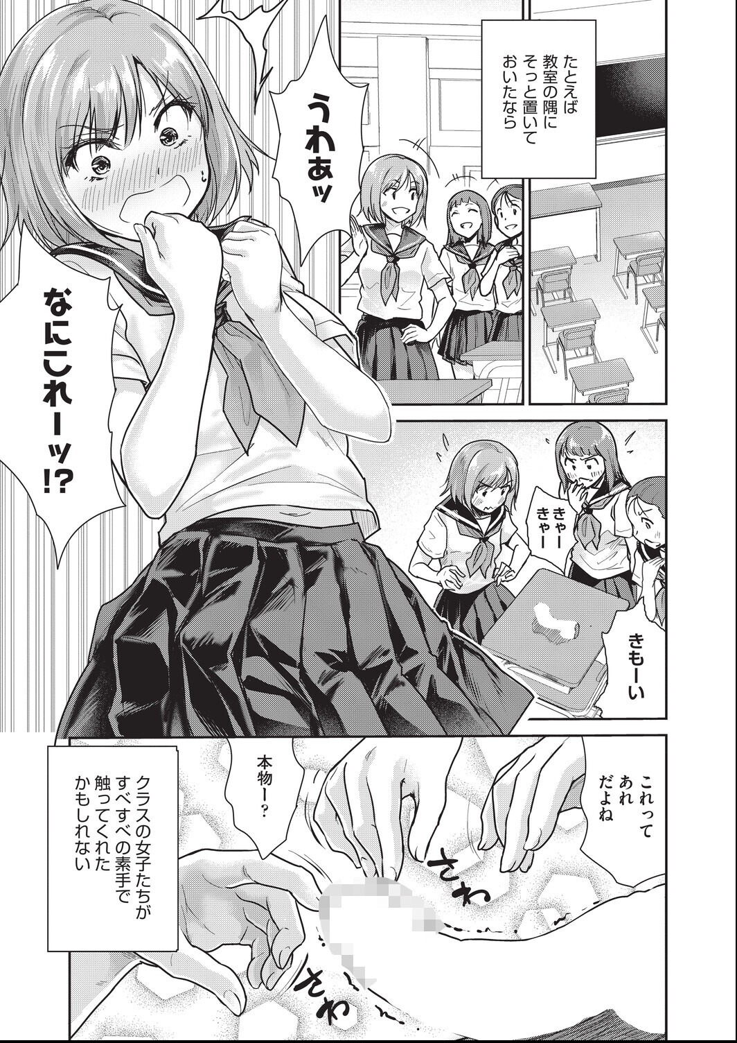 教室の女子の机の上に突然「ち●こ」が現れた!?女子たちが恐る恐る素手で触ったり、経験豊富な女子が彼氏のと比べてみようとフェラするように舐めまわしそのまま口の中でビクンビクンと出してしまう!?椅子に放置された「ち●こ」に気がつかずに着席した女子が授業中にも関わらず回りに気がつかれない様にこっそりアソコへ挿入し膣奥射精を受け入れてしまう…。人気のない女子バレー部の更衣室で「ち●こ」を見つけた女子がセックスを試したくなり…!?などなど2回目のオナニーを終えて寝落ちした男子の「ち●こ」妄想!!